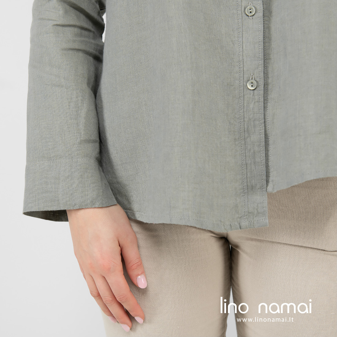 • Lininė žalsva palaidinė ilgom rankovėm, asimetriška apačia.