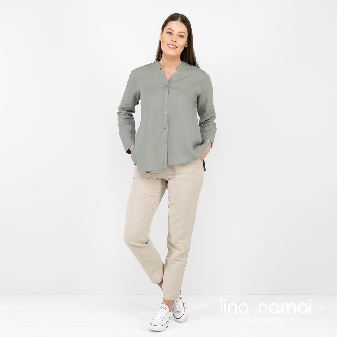 • Lininė žalsva palaidinė ilgom rankovėm iš nugaros.