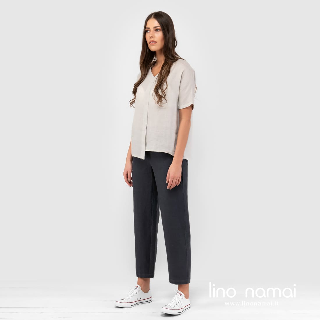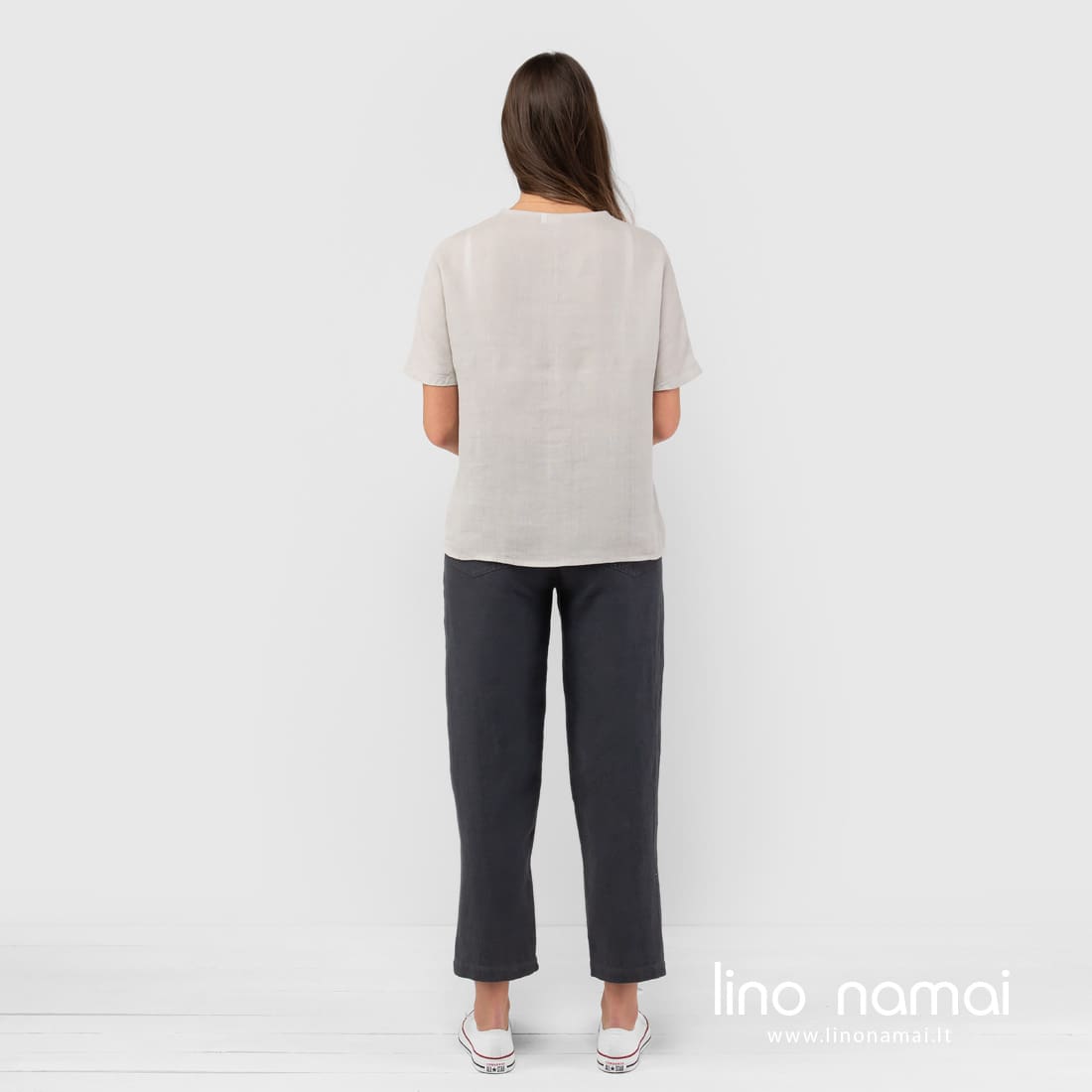 VIETNAM šviesiai pilka palaidinė. Jos 100% lino audinys melanžinis: jame suaudėme šviesius rusvai pilkus ir melsvai pilkus verpalus. Lengvo šviesios spalvos lino drabužis išsiskiria savo asimetriškomis linijomis. Šis siluetas drąsioms, išskirtinį stilių mėgstančioms moterims ir merginoms!