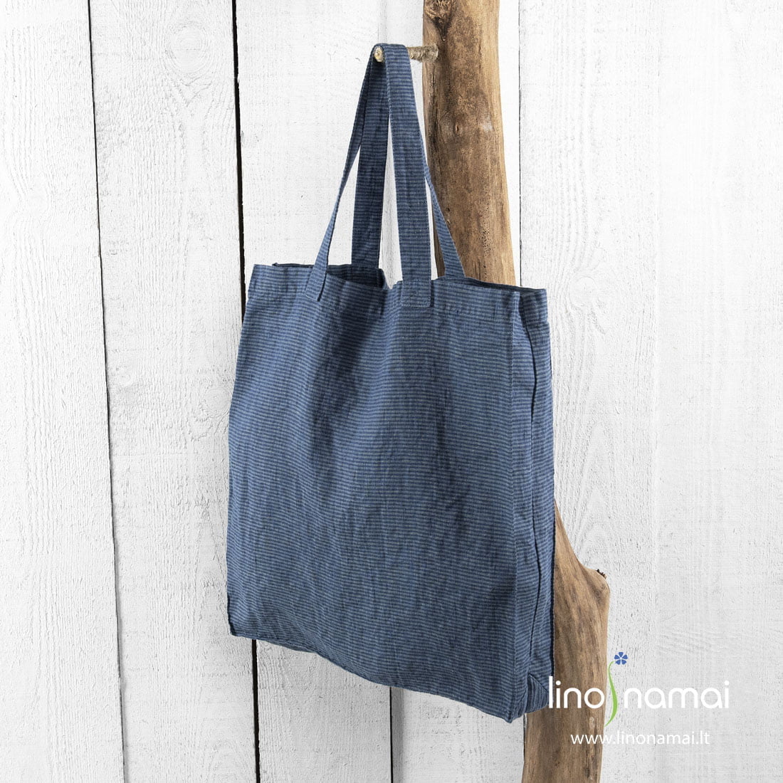 Lininis krepšys mėlynai dryžuotas. Jo siaurų juostelių audiniui išausti naudojome mėlynai pilkus, žalsvai pilkus ir tamsiai mėlynus verpalus. Tvirtas, tankus, sunkus gaminio audinys buvo išskalbtas specialiu būdu, tapo minkštas, įgavo nelygią struktūrą, nebesitrauks skalbiamas. Rankenų ilgis 46cm. Tinka ir nedideliems pirkiniams, ir paplūdimio reikmenims susidėti. Natūralaus audinio krepšys ypač tiks kaip šiltojo sezono aksesuaras.