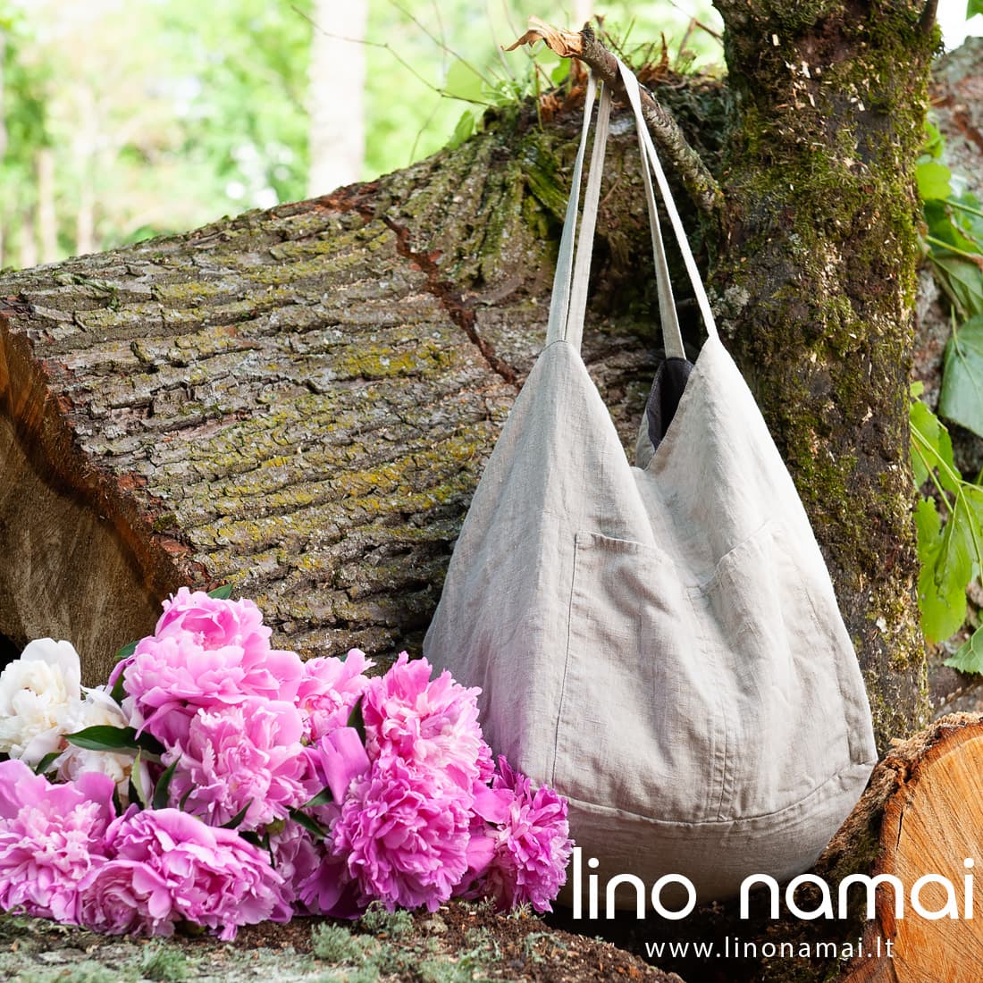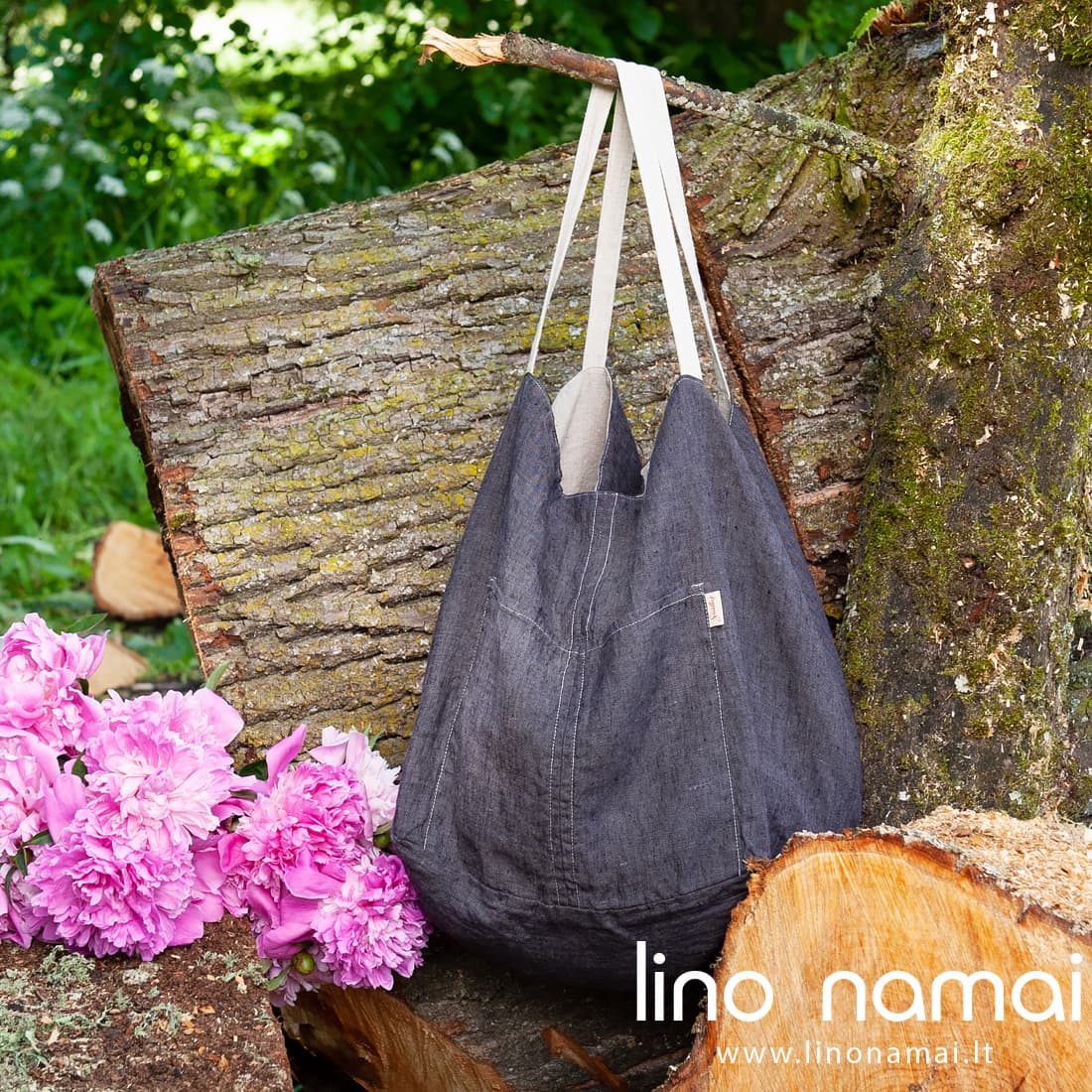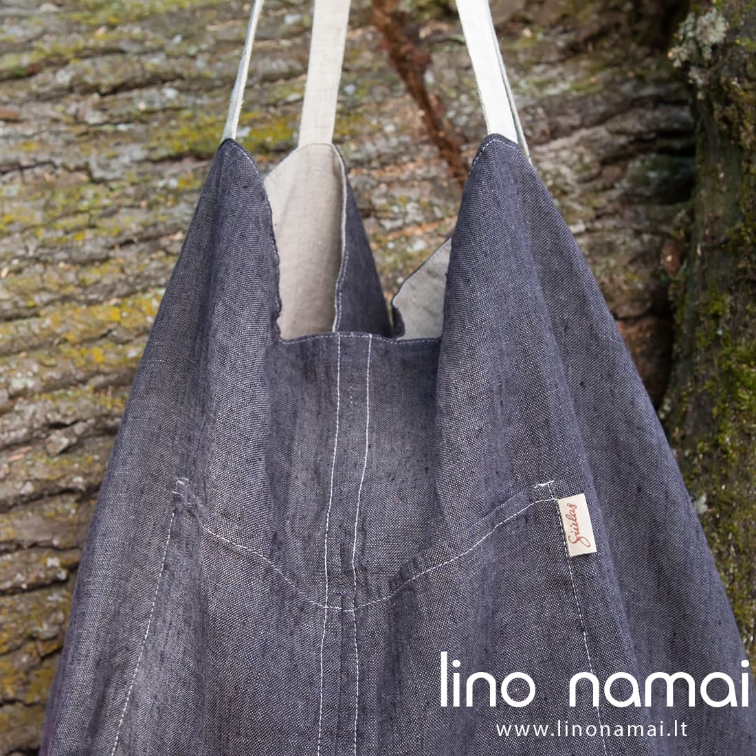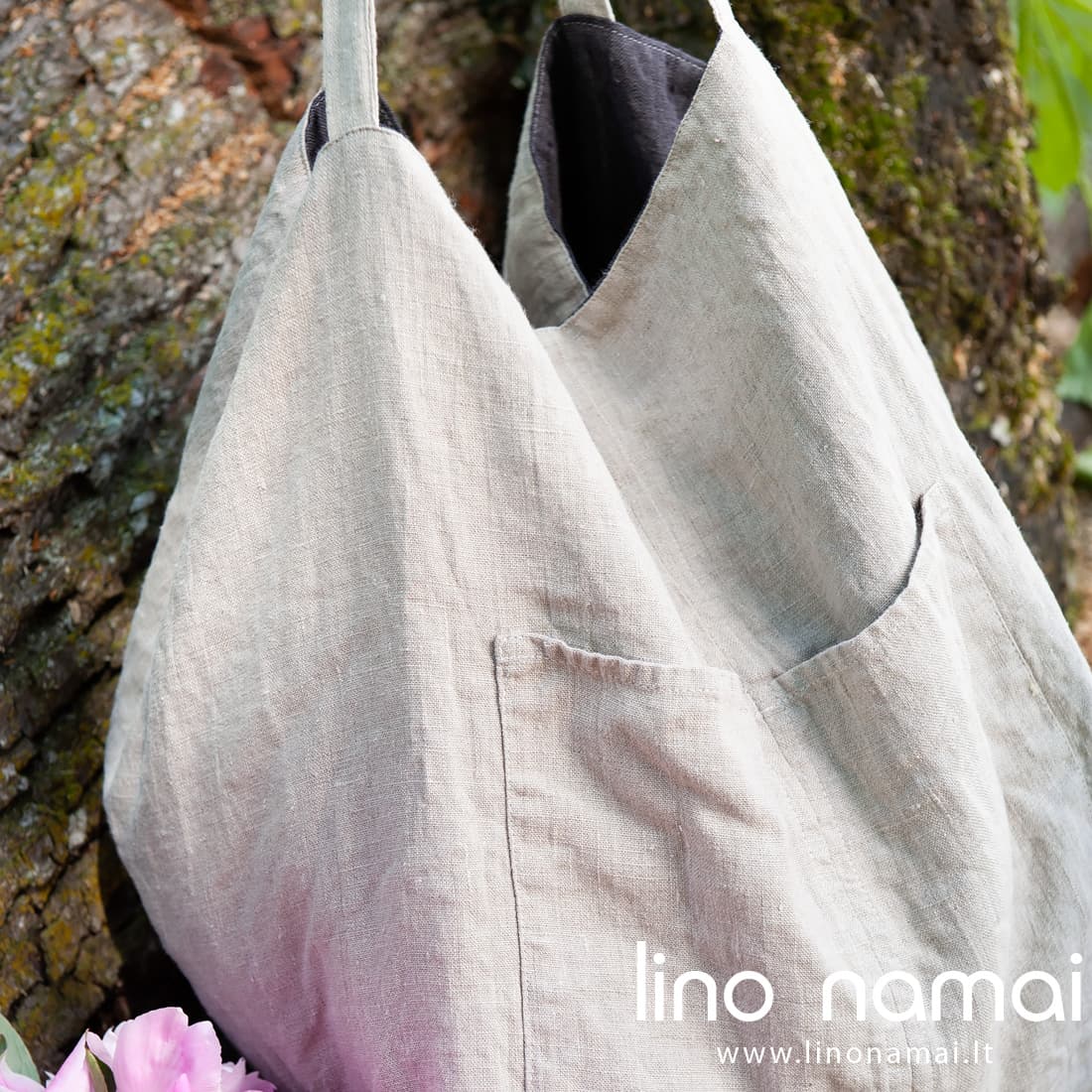 Dvipusiui lininiui krepšiui pasiūti naudoti du minkšti skalbti audiniai: tamsiai pilkas ir rusvai pilkas (natūralios lino spalvos, austas iš nedažytų verpalų). Abi krepšio pusės su kišenėmis. Rankenos 47cm ilgio, pasiūtos iš šviesiai pilko audinio. Pasirinkite Jums patinkančią aksesuaro spalvą tiesiog jį išversdami. Rinkitės pagal nuotaiką, derinkite prie aprangos. Talpus praktiškas krepšys nepamainomas vasarą vykstant prie jūros ar iškylauti.