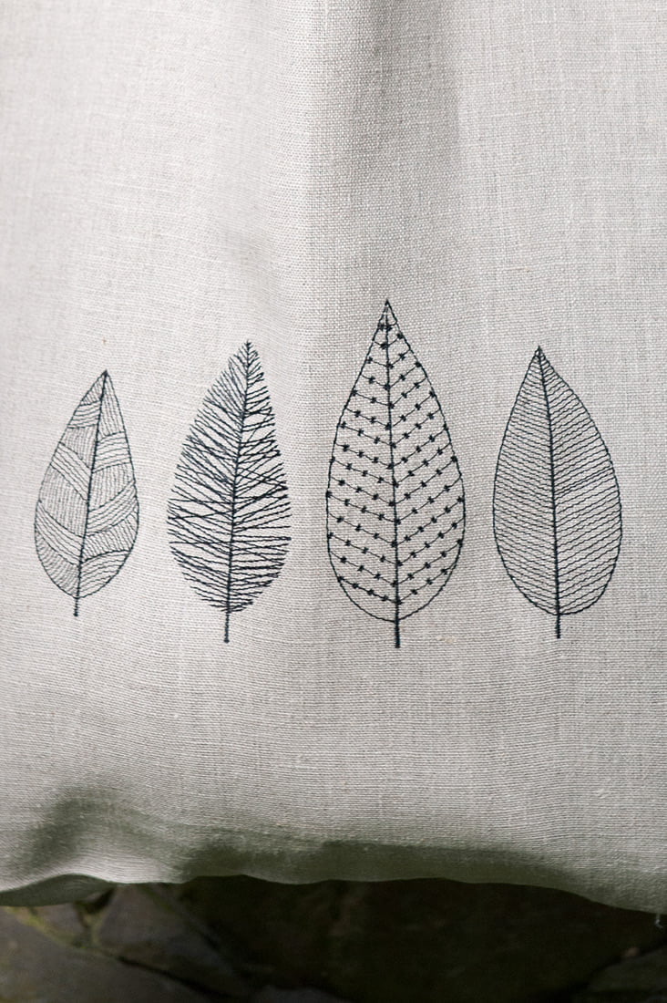 Lininis krepšys iš rusvai pilko audinio (natūrali lino spalva). Grafiški siuvinėti juodos spalvos lapeliai puošia šį gaminį, traukia žvilgsnį. 50cm ilgio rankenos iš juodos spalvos audinio. Subtilus siuvinėjimas, elegantiška spalvų dermė patiks natūralumo ir elegancijos mėgėjoms.