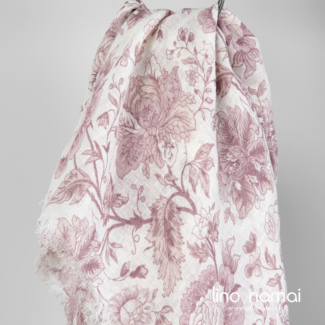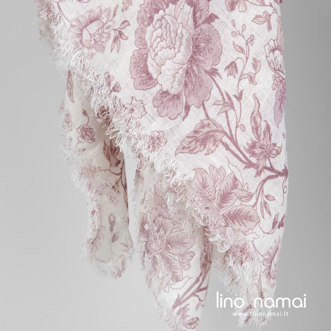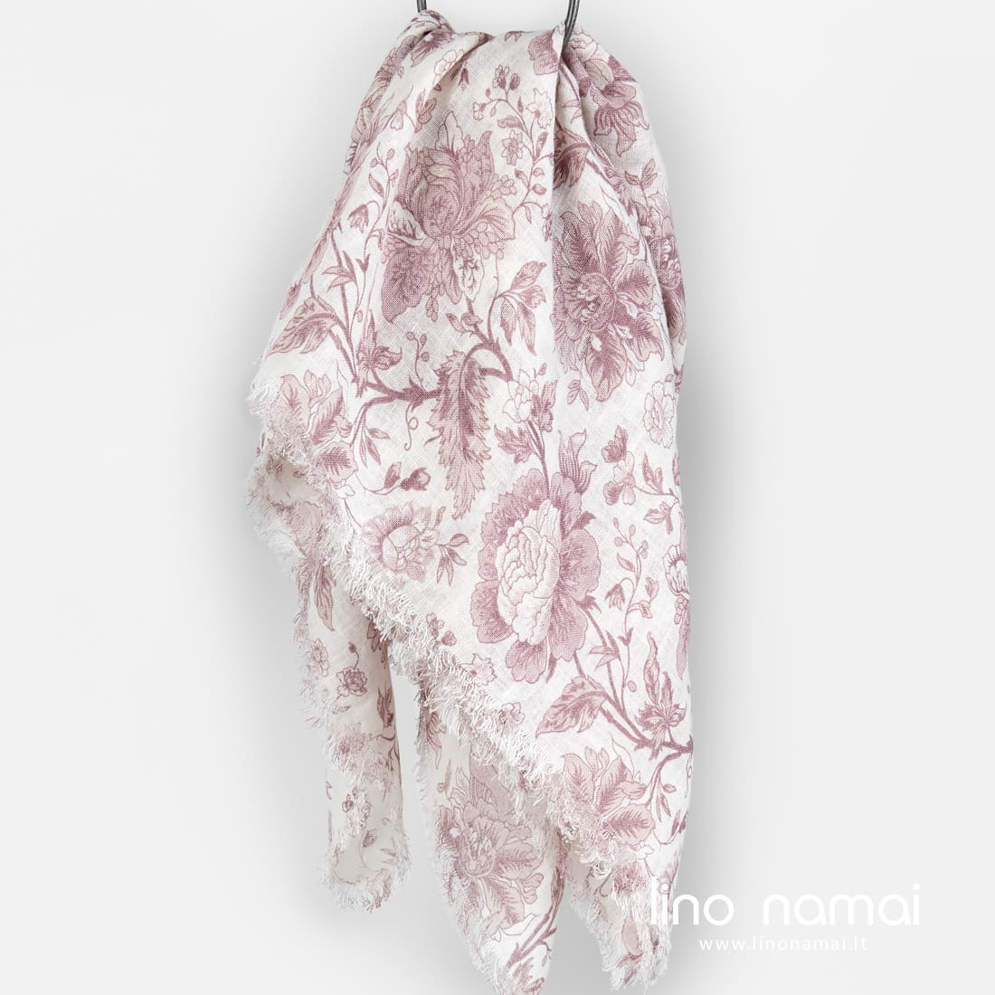 Balta lininė skara rausvomis gėlėmis, pasiūta iš minkšto, švelnaus, specialia technologija skalbto audinio. 2cm ilgio pešioti žaismingi kutai užbaigia visas kraštines. Draugiškas odai ir nepaprastai puošnus aksesuaras pagyvins šviesių spalvų drabužių derinį pavasarį ar vasarą.