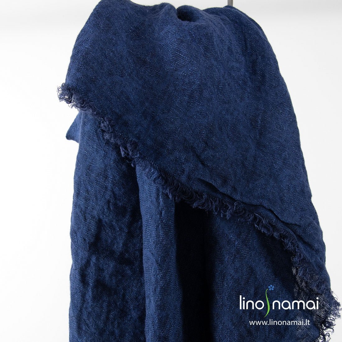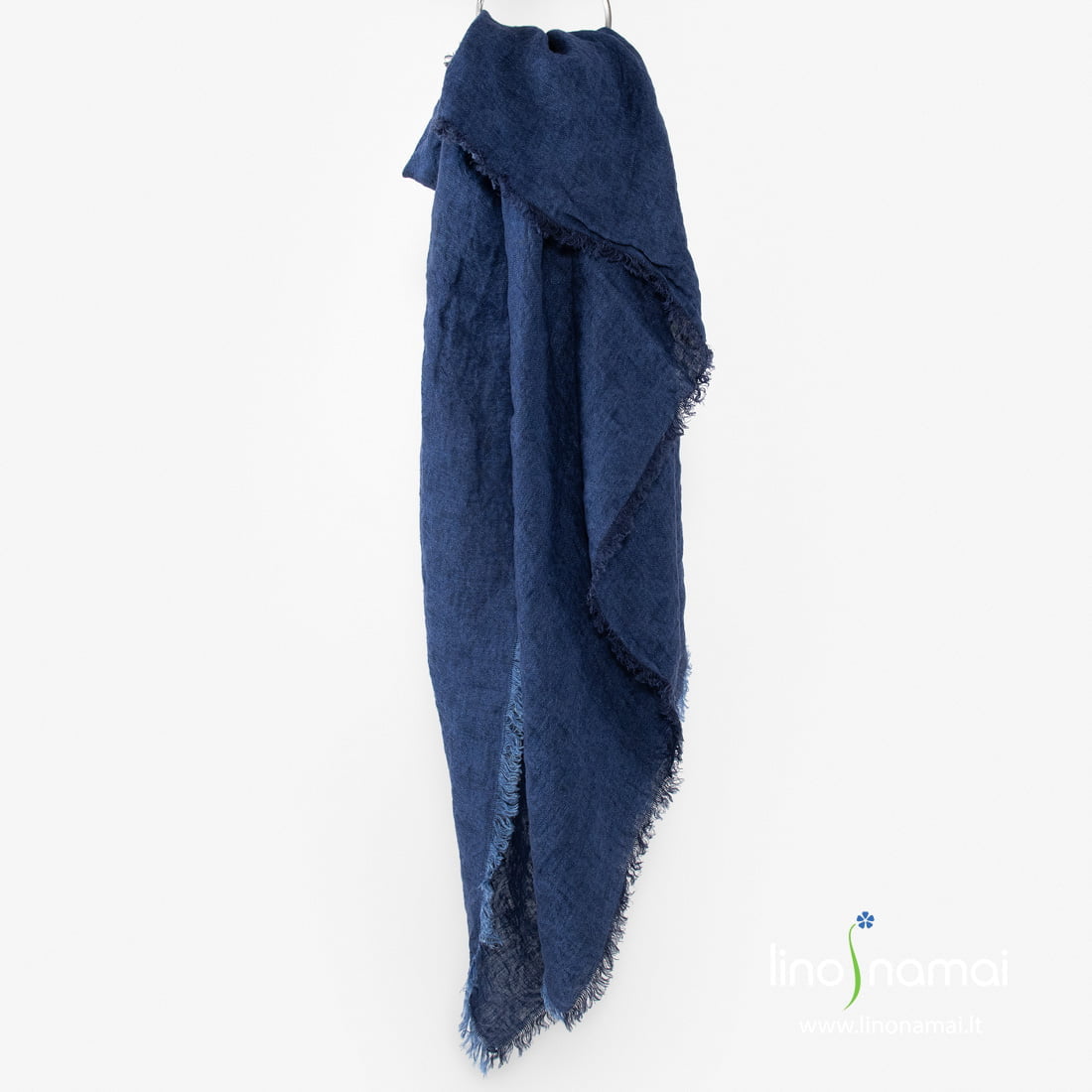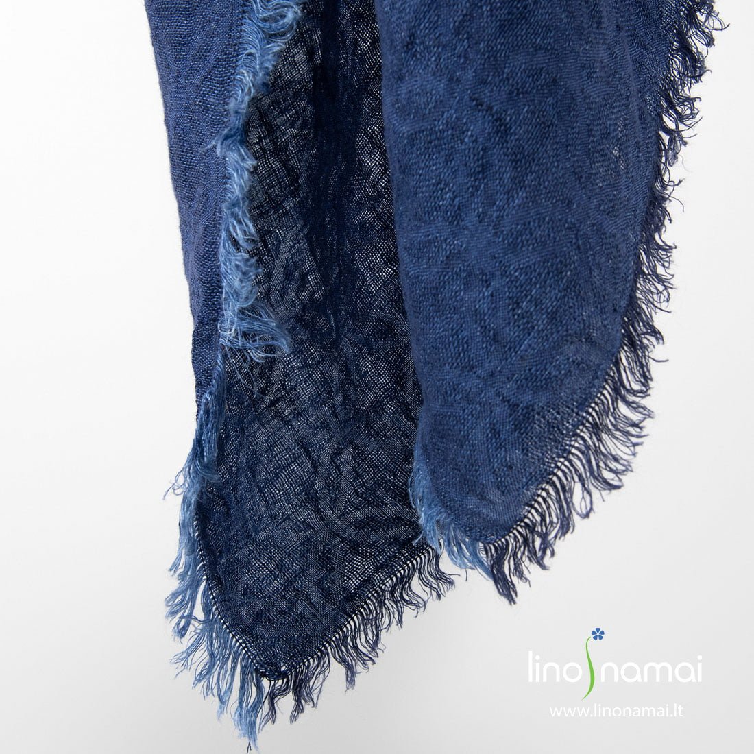 Lininė tamsiai mėlyna raštuota skara. Žakardiniui šio gaminio audiniui išausti naudojome dvejus tamsiai mėlynus labai panašius vienas į kitą verpalus, todėl audinio raštas (susikertantys apskritimai) iš pirmo žvilgsnio nelabai matosi. Jis išryškėja priklausomai nuo šviesos kritimo kampo. Skarą išskalbėme specialiu būdu, kad lininis jos audinys taptų minkštas, švelnus, malonus odai, nebesitrauktų skalbiamas. Papuošėme pešiotais kutais aplink. Labai įdomus aksesuaras!