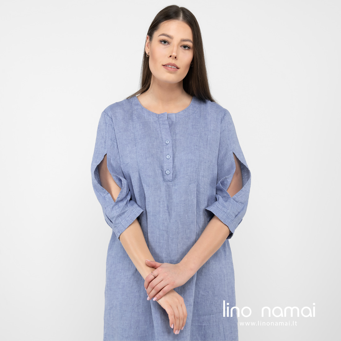 • Lininė suknelė su kiauromis rankovėmis, susegimas priekyje.
