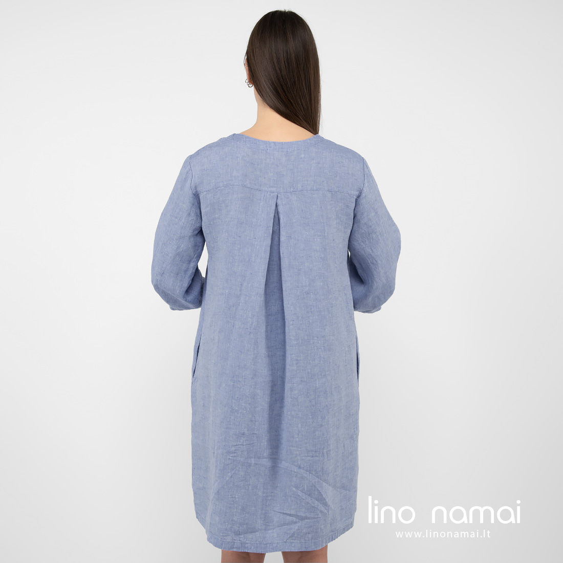 • Lininė suknelė su kiauromis rankovėmis iš nugaros.