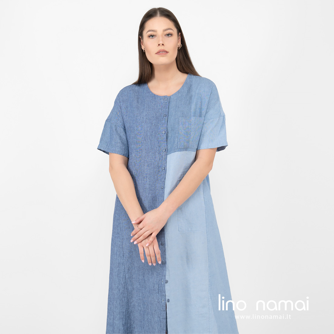 • Lininė melsva ilga suknelė su spaudėmis per visą ilgį.