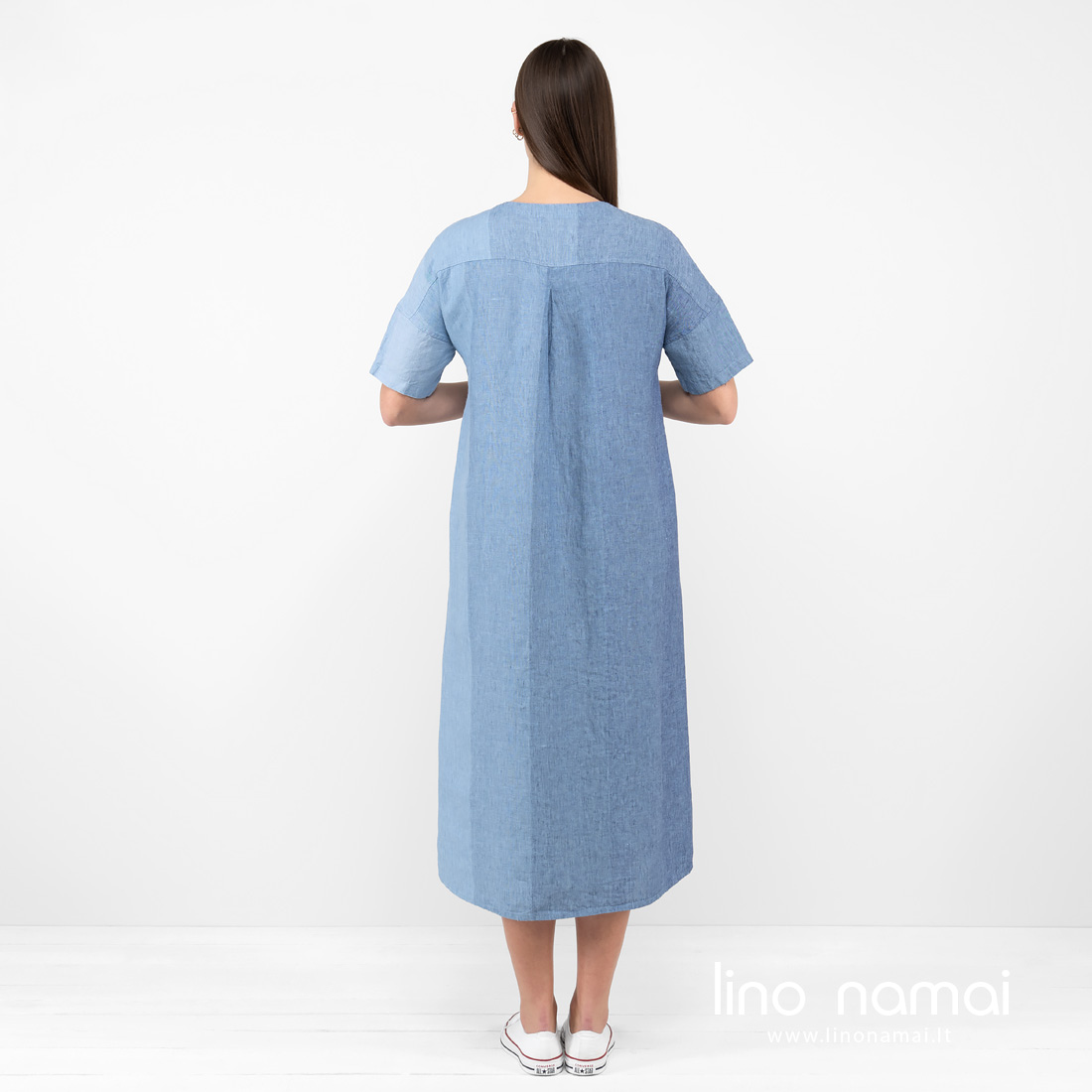 • Lininė melsva ilga suknelė iš nugaros.