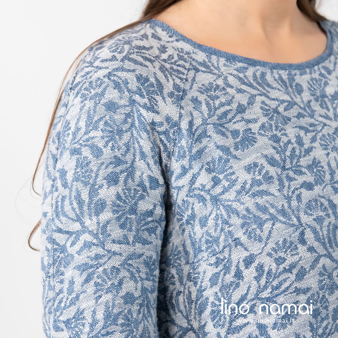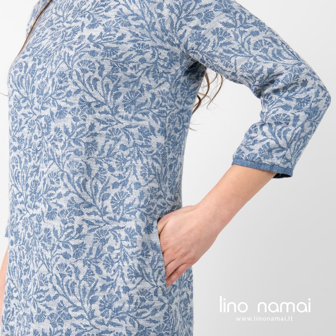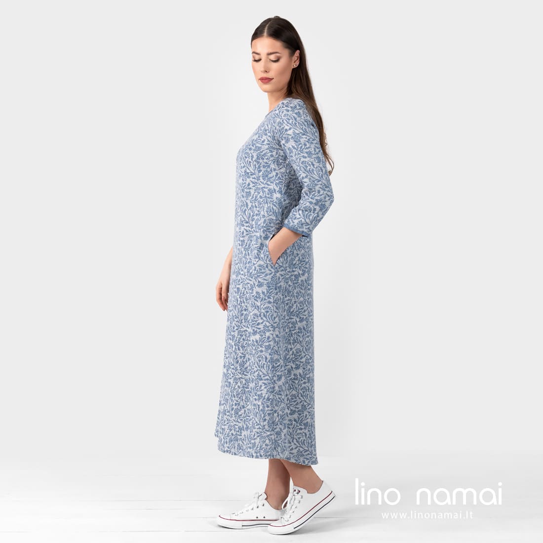 • Tiesaus silueto ilga lino-medvilnės suknelė su mėlynomis gėlėmis