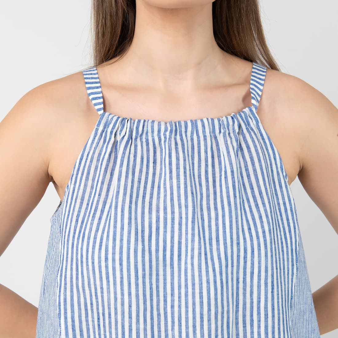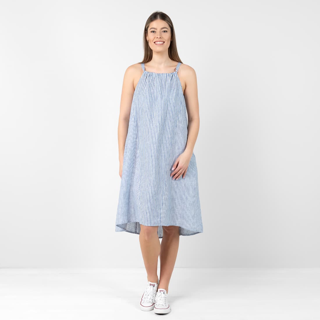• Lininė mėlynai dryžuota suknelė su petnešomis, kurių juostelės surišamos nugaroje