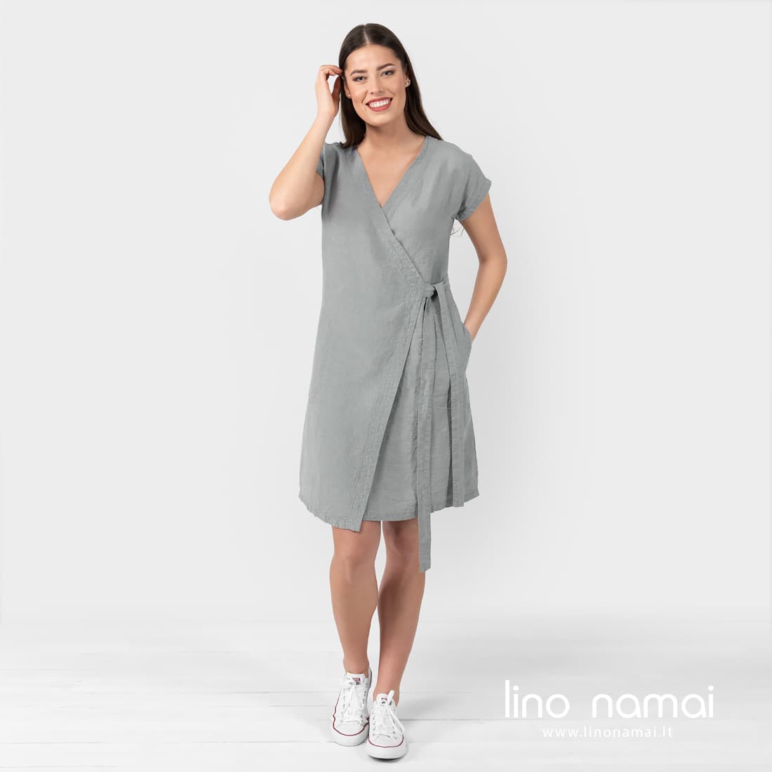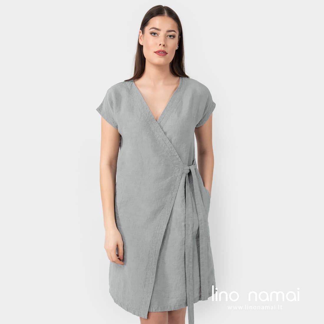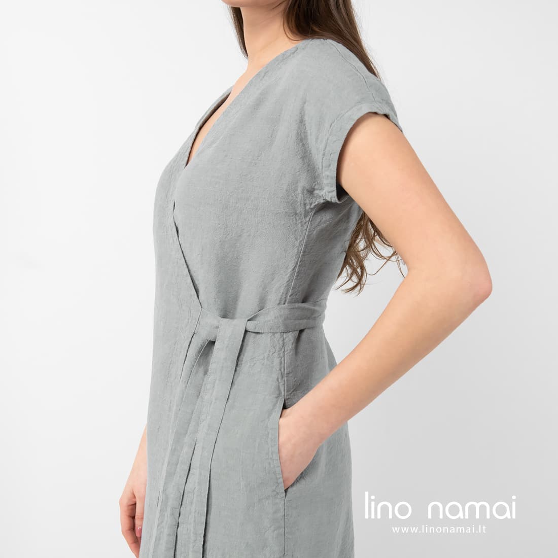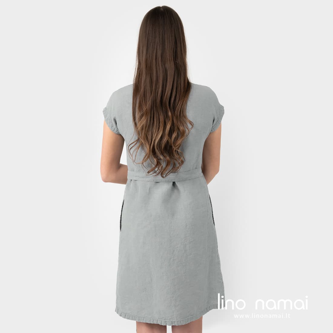 • Lininė šviesiai pilka suknelė su diržu surišamu šone, su kišenėmis