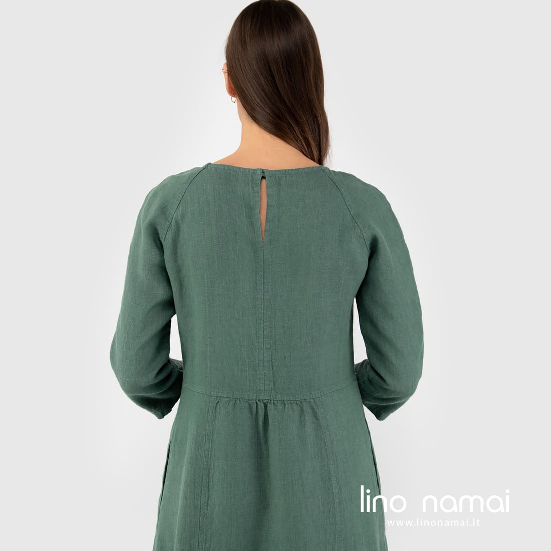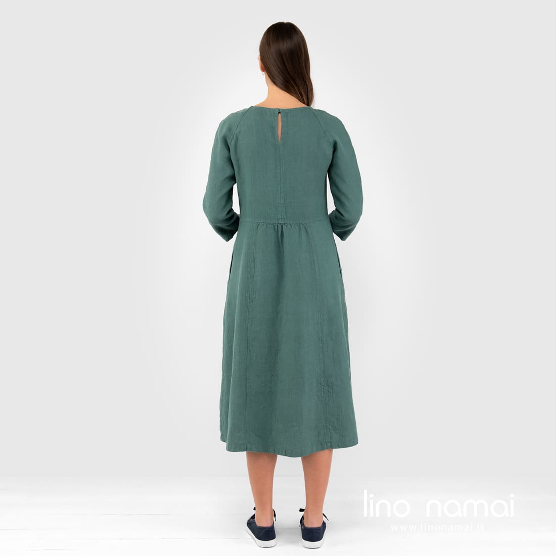 Lininė žalia suknelė. Šiam gaminiui naudojame melanžinį audinį. Jame suausti tarpusavyje gražiai derantys žali ir mėlynai pilki verpalai. Tvarios, ilgaamžės mados mylėtojos, sąmoningo vartojimo šalininkės, natūralumo gerbėjos, ši lino suknelė sukurta specialiai Jums: paprasto kirpimo, subtilios spalvos modelis leis šį drabužį dėvėti ne vienerius metus.
