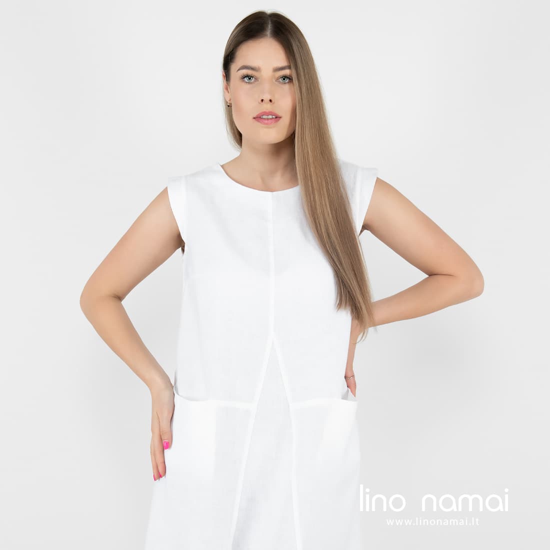 • Ilga ryškiai balta berankovė lininė suknelė