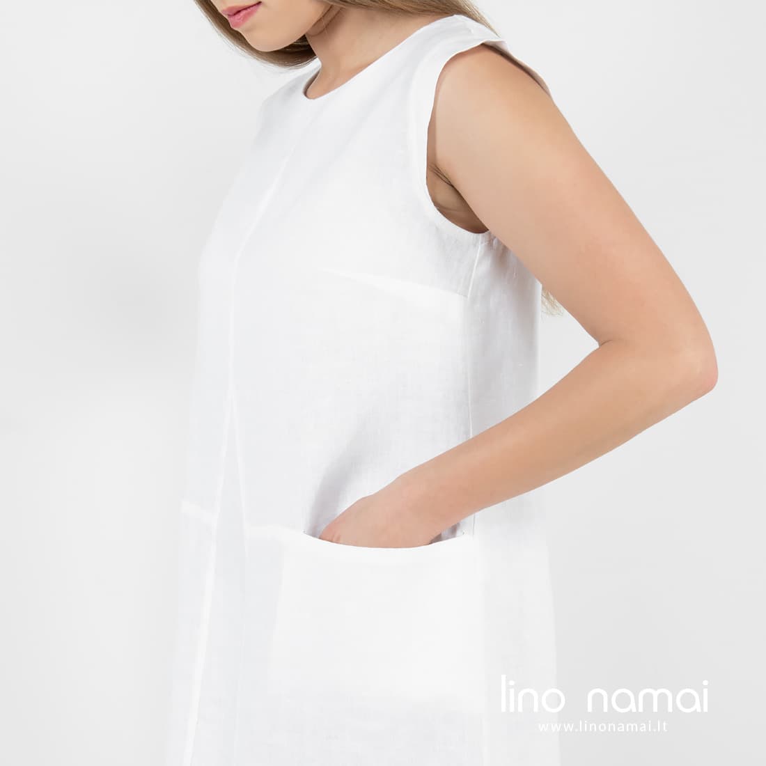 • Ilga ryškiai balta berankovė lininė suknelė apvalia iškirpte