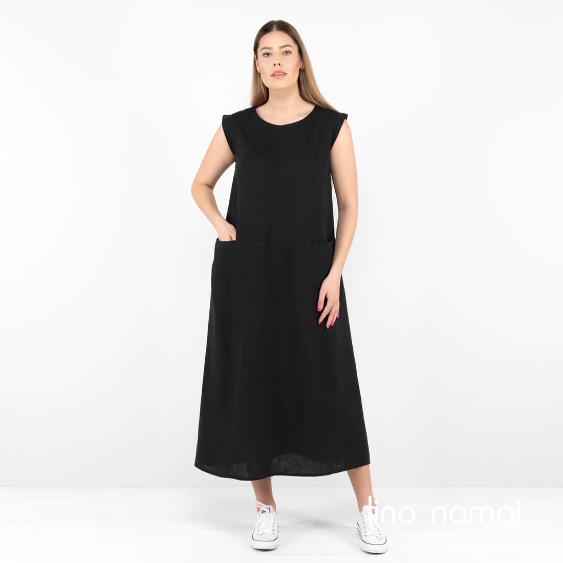 • ELLE lininė juoda suknelė su kišenėmis šonuose
