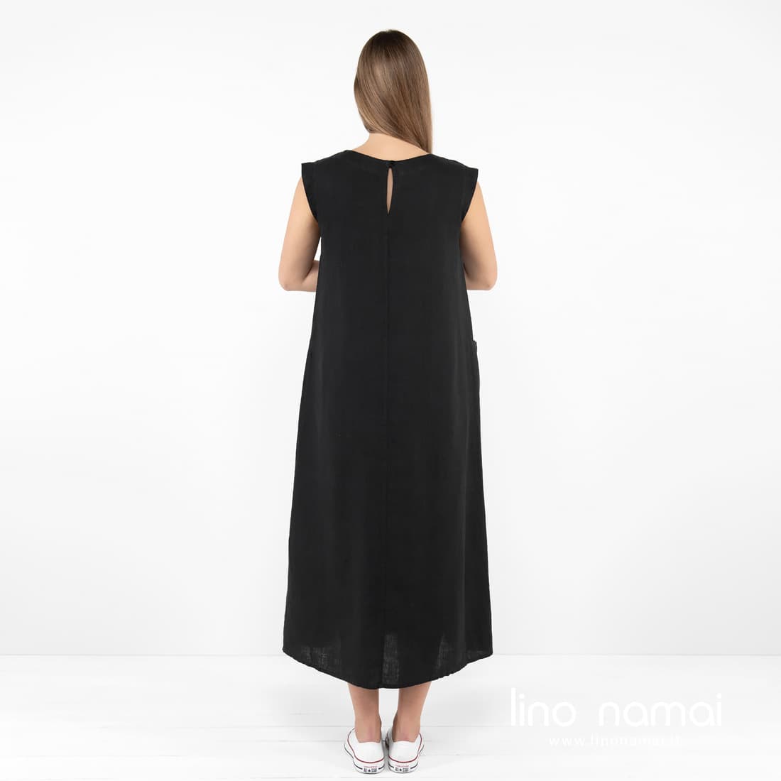 • Ilga juoda berankovė lininė suknelė