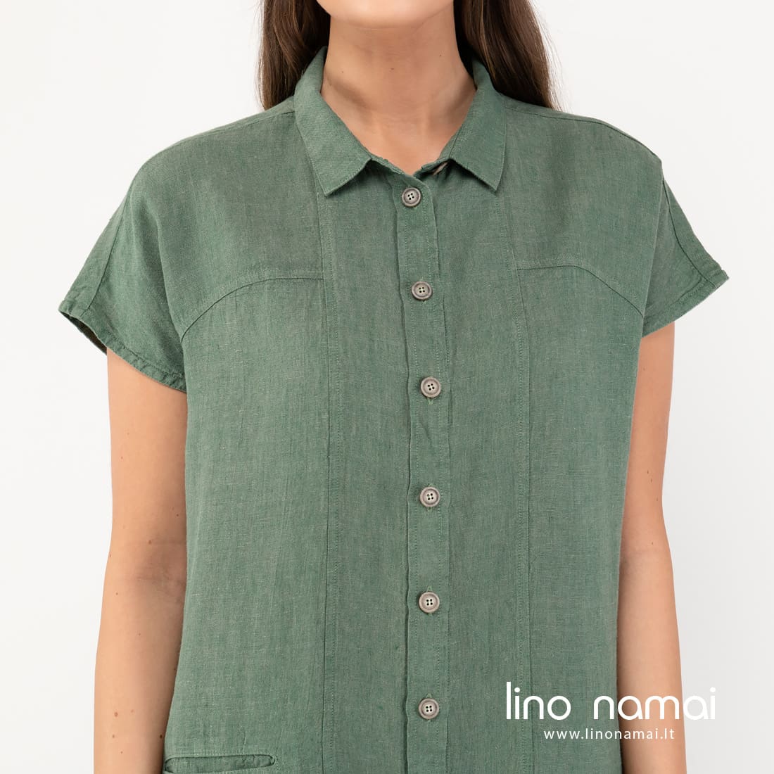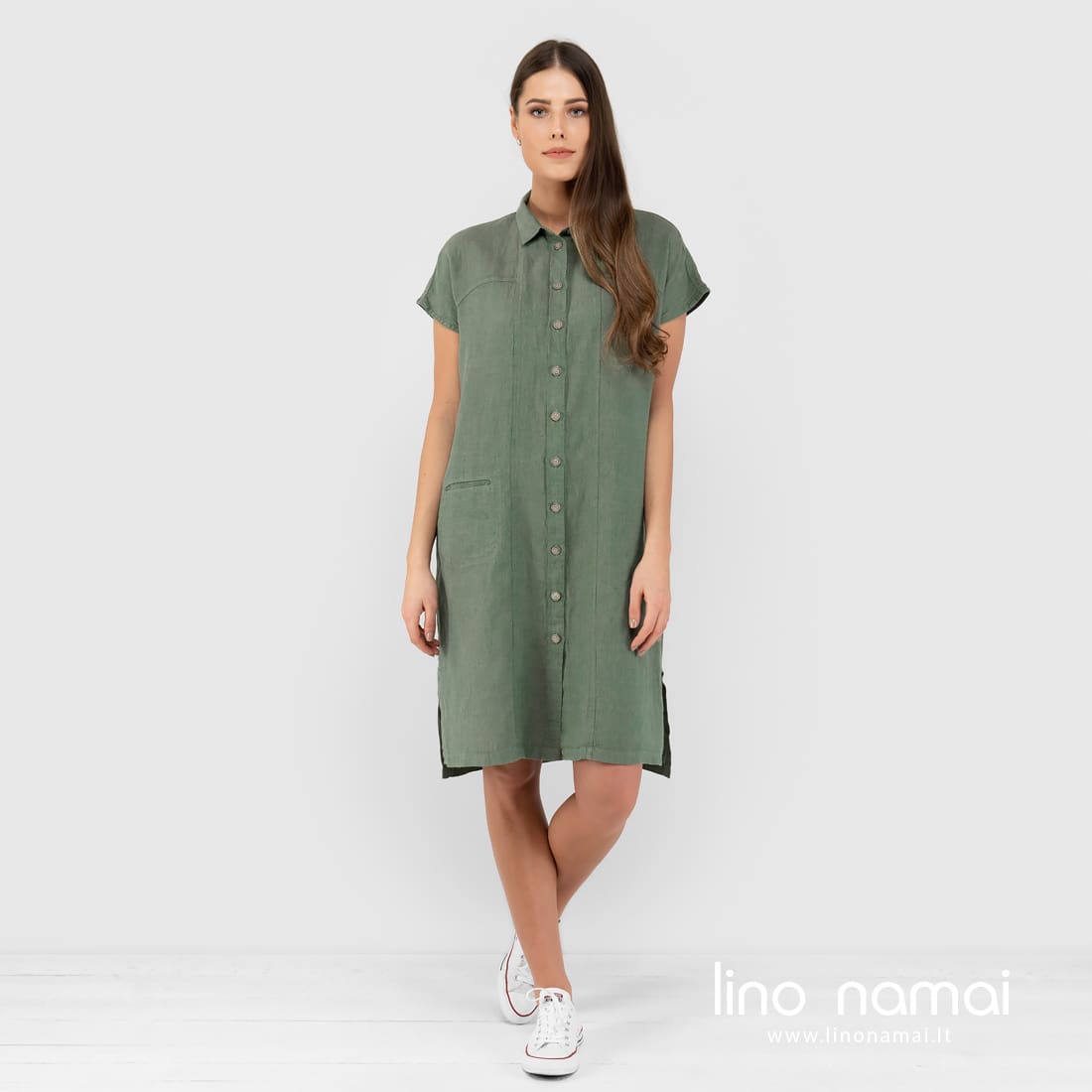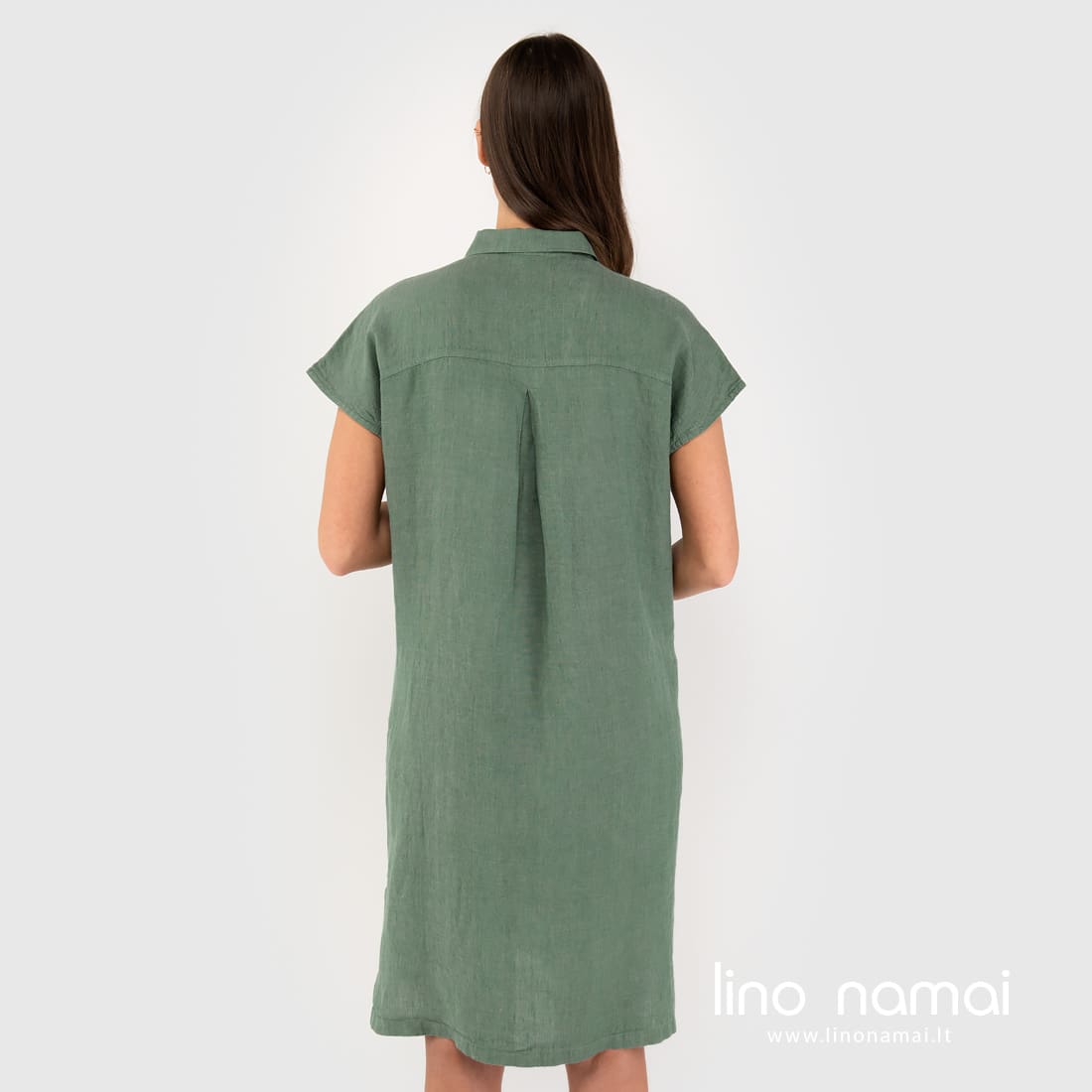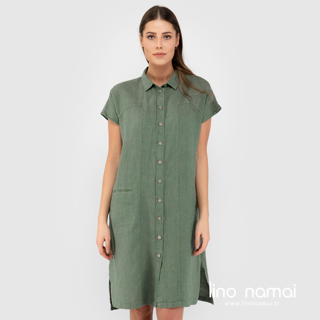 GINA žalia suknelė iš melanžinio audinio, kuriame žalios spalvos verpalus suaudėme su žalsvai pilkais verpalais. Todėl drabužis turi lengvą pilką atspalvį. Šią laisvo kirpimo marškinių stiliaus suknelę siuvame net iki 50 dydžio. Jauskitės patogiai, atrodykite gražiai visą vasarą!