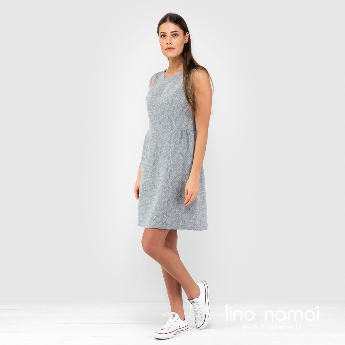 JAMAIKA pilka suknelė. Šio drabužio audinys melanžinis: išaustas naudojant mėlynai pilkus ir baltus verpalus. Puošnumo suteikėme įausdami smulkius baltus rombus. Lino suknelė vasarą - tiesiog nepakeičiamas drabužis. Įsigykite, puoškitės, pajuskite išskirtinį dėvėjimo komfortą.