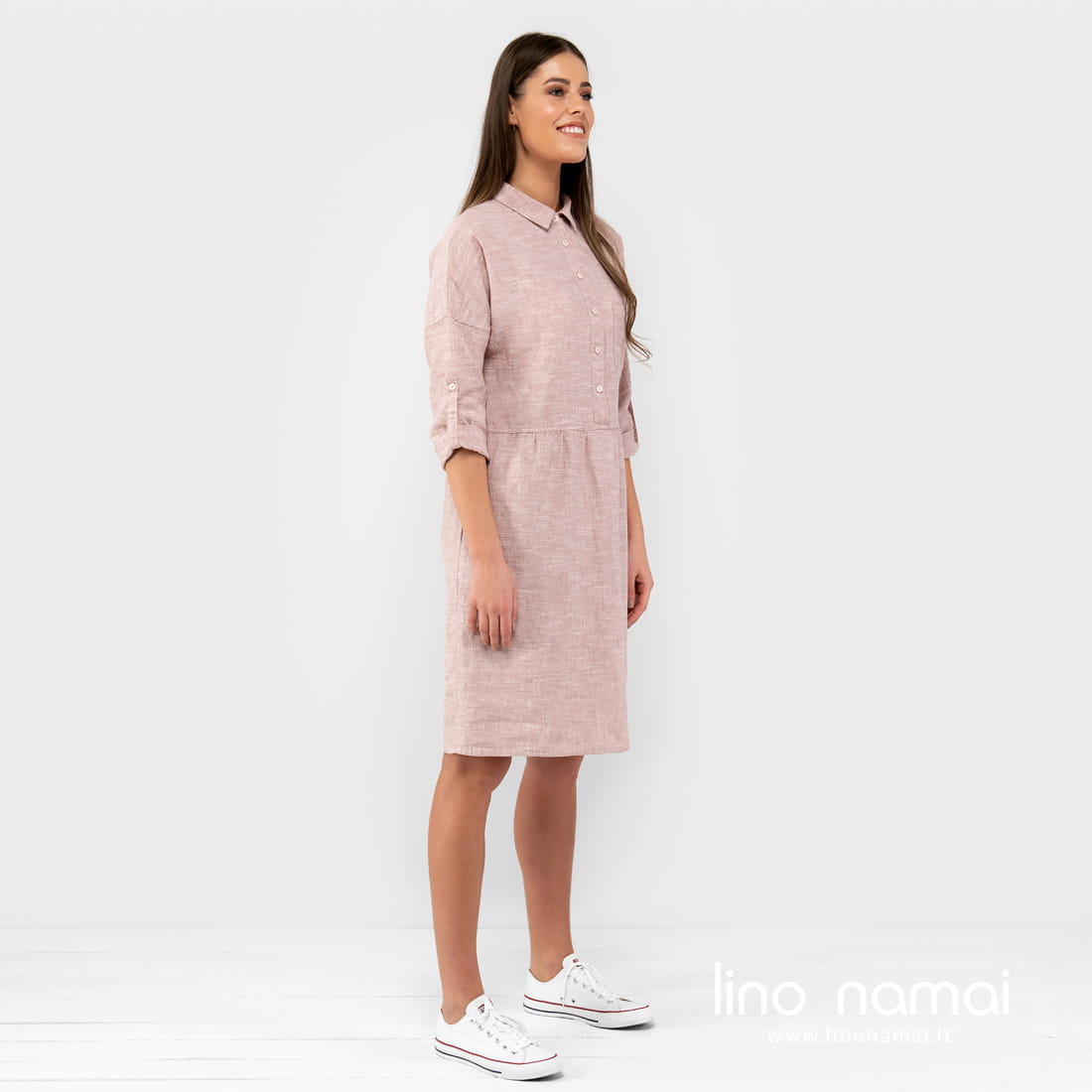 JUDIT suknelės audinys melanžinis: išaustas iš pieno baltumo (gelsvai baltų) lino ir rusvų, primenančių molio spalvą, medvilnės verpalų, pagyvintas horizontaliais baltais dryžiukais iš verpalų su specialiais sustorėjimais. Šis drabužis savyje talpina klasikinį marškinių dizainą, patogumą dėvint, laisvumą ir nepaprastą audinio minkštumą. Subtiliai gražu ir visiška judesių laisvė - tobulas derinys vasarai!