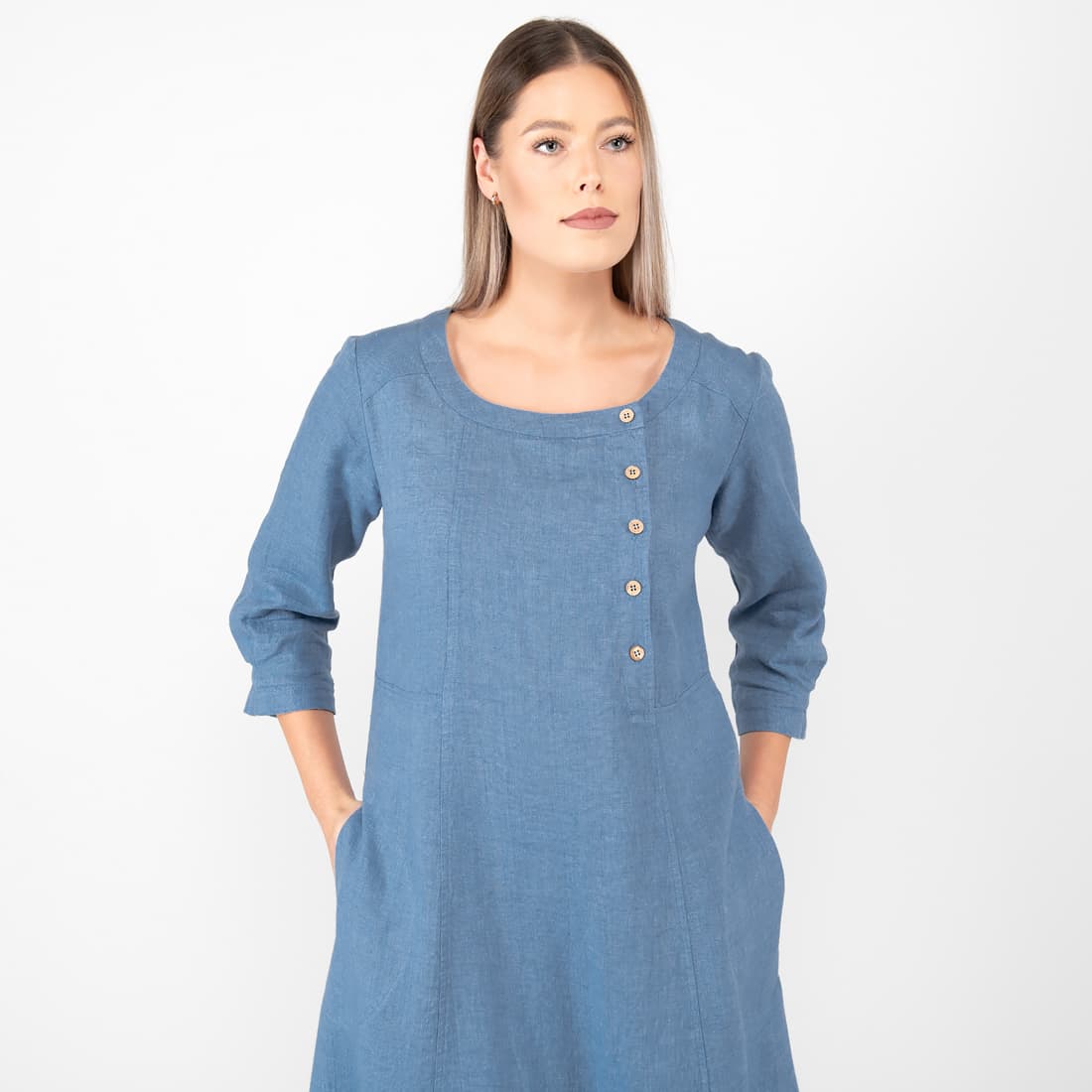 • Lininė mėlyna suknelė su asimetrišku sagų užsegimu priekyje