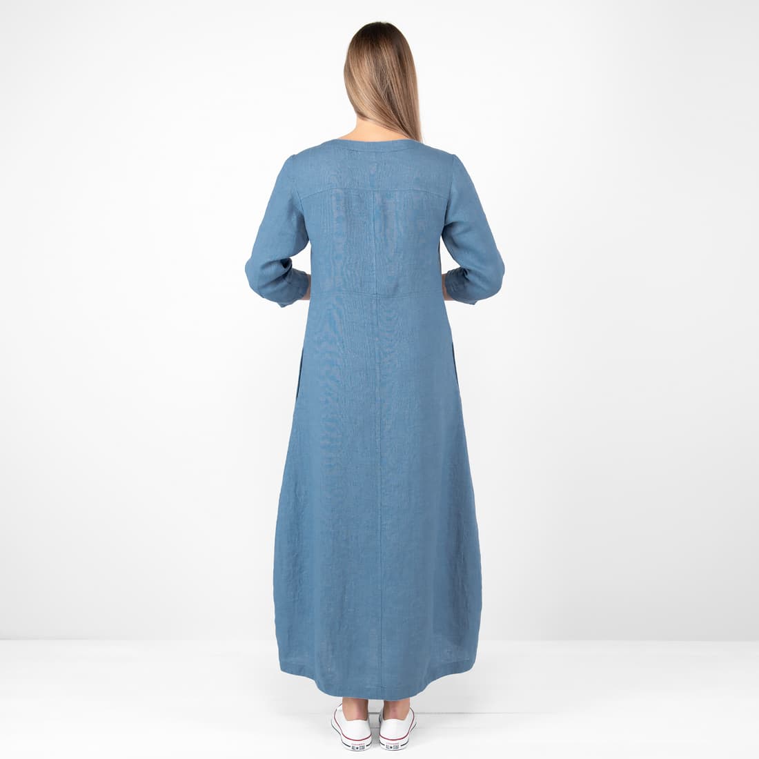 • Lininė mėlyna suknelė ilga su 3/4 rankovėmis