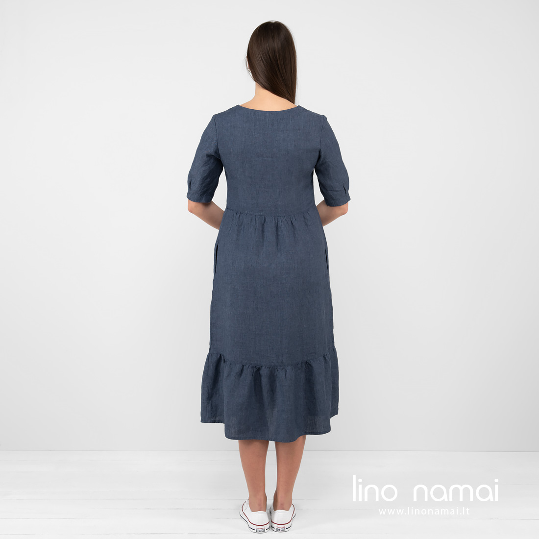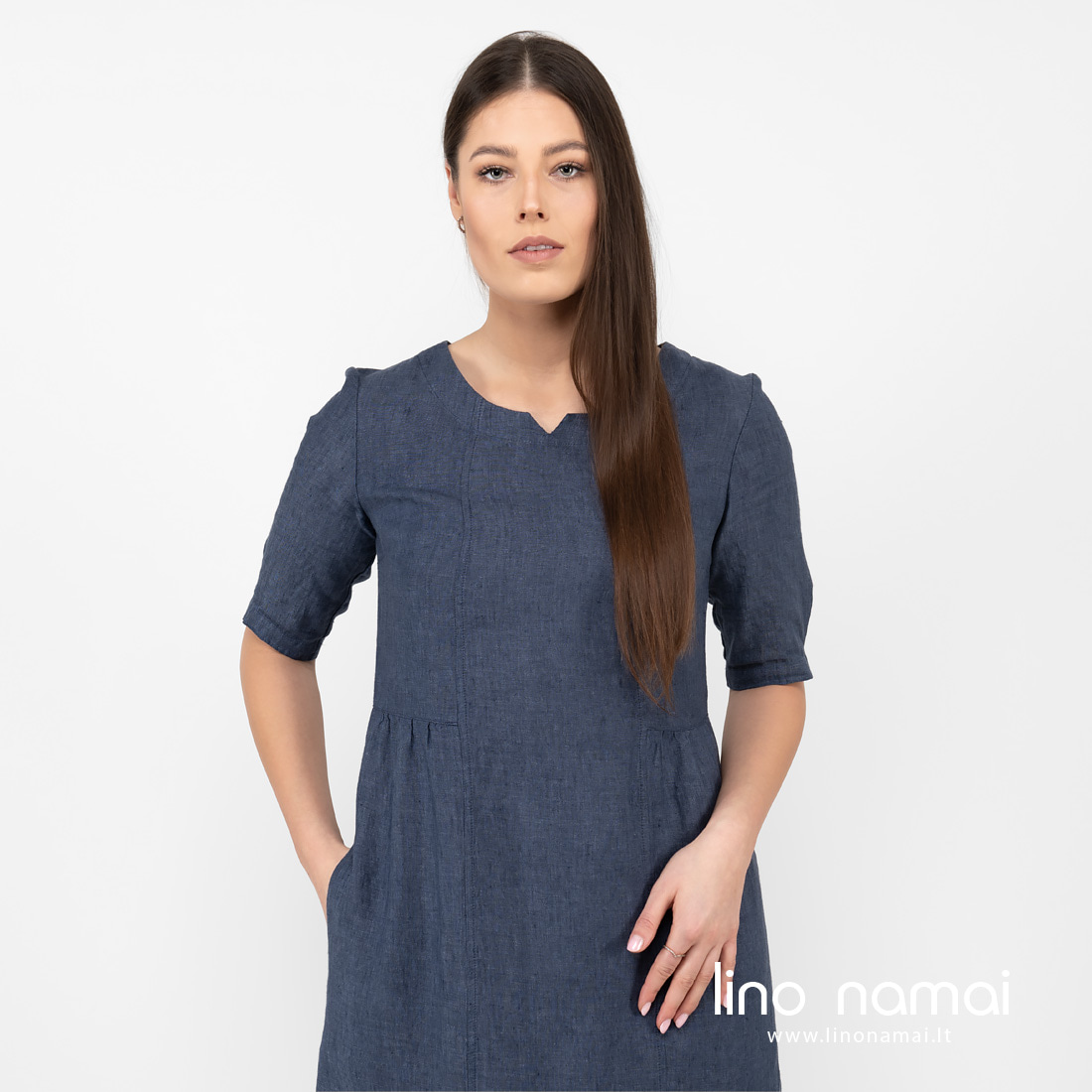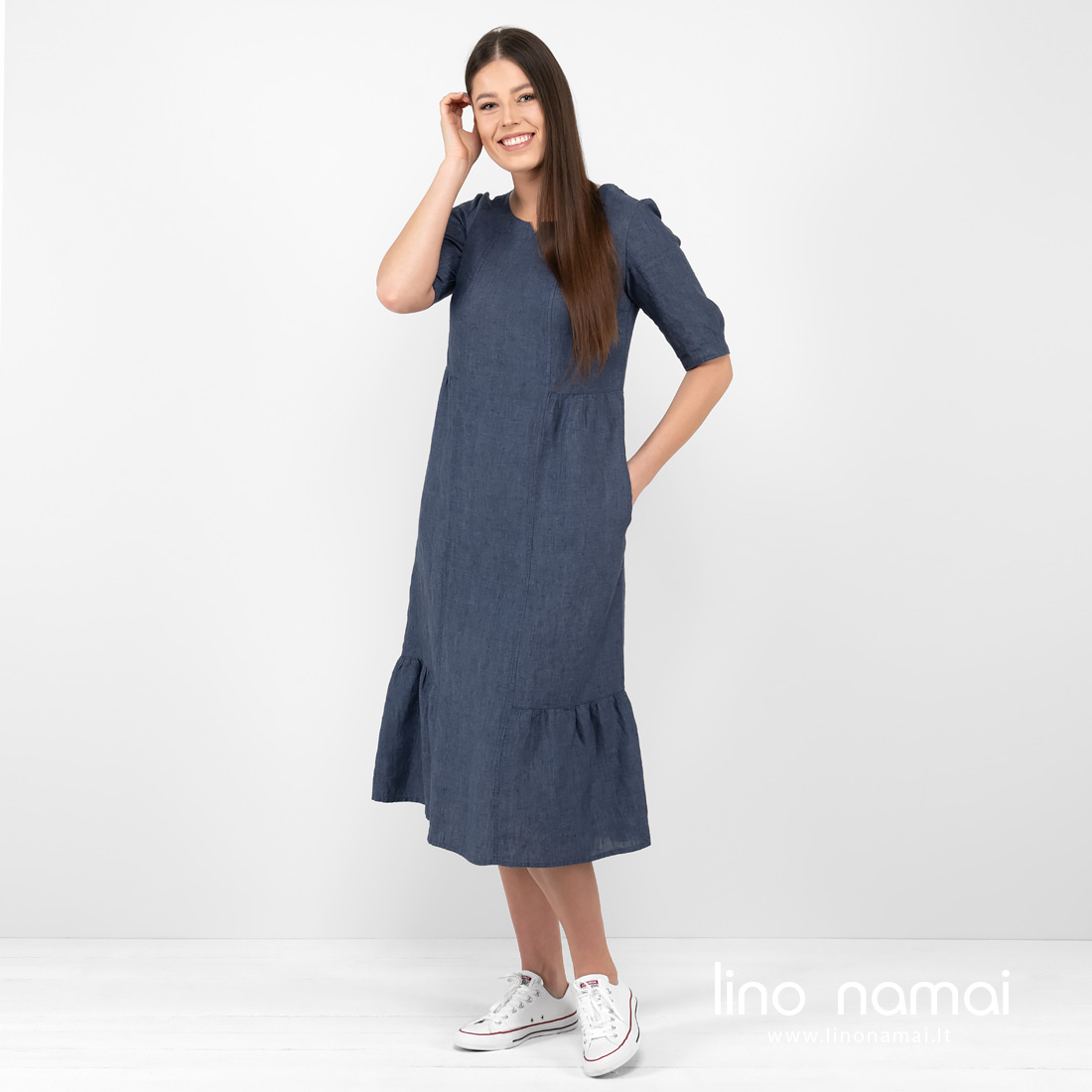 • Lininė mėlyna ilga suknelė, kišenės šonuose.