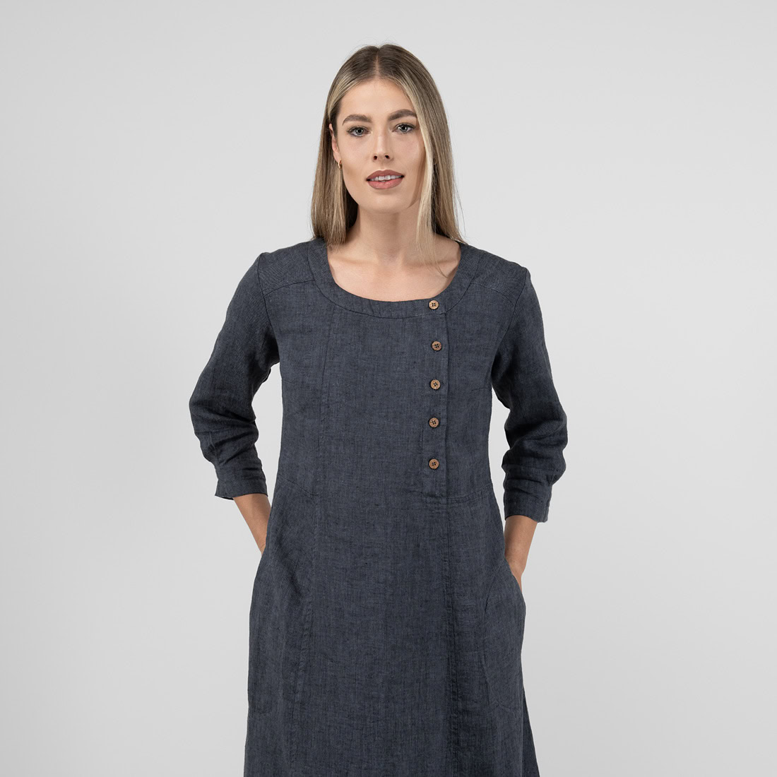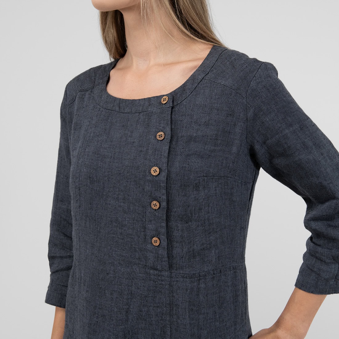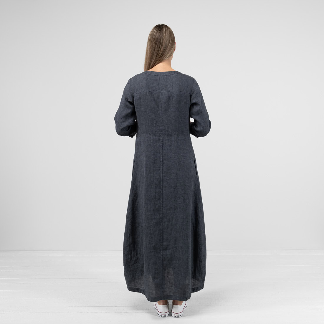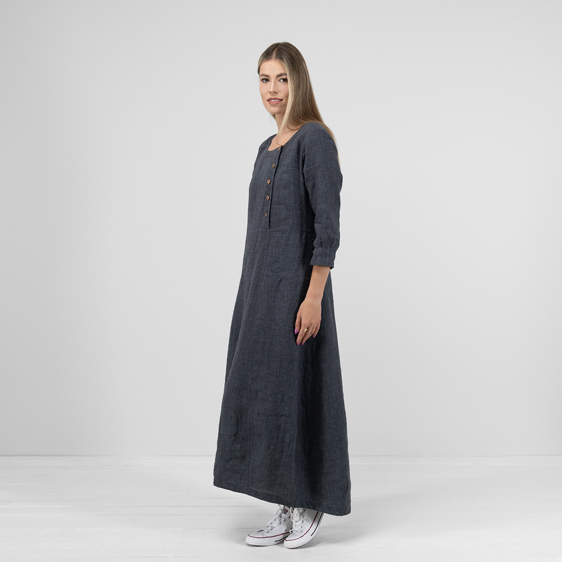 Ilga suknelė iš tamsiai pilkos spalvos lininio audinio. Laisvas, judesių nevaržantis vasarinis drabužis, be kurio neapsieis patogumą ir natūralumą vertinančios moterys ir merginos.