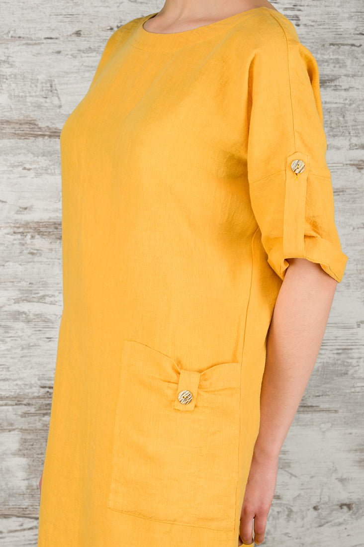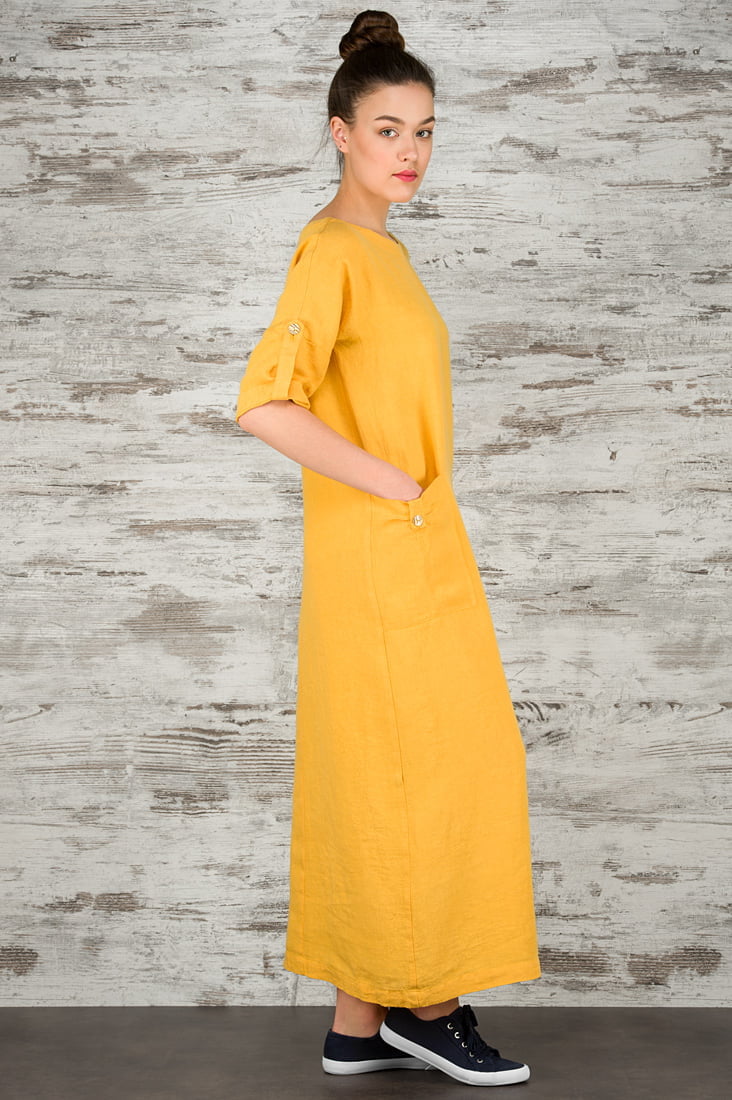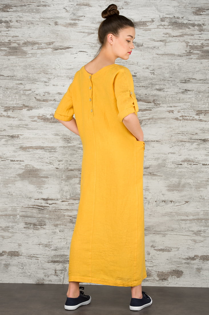 Geltonos spalvos 100% lino audinio suknelė. Ilga, laisva, nevaržanti judesių, oversize stiliaus. Dėvėkite ir gyvenkite atostogų nuotaika KASDIEN!