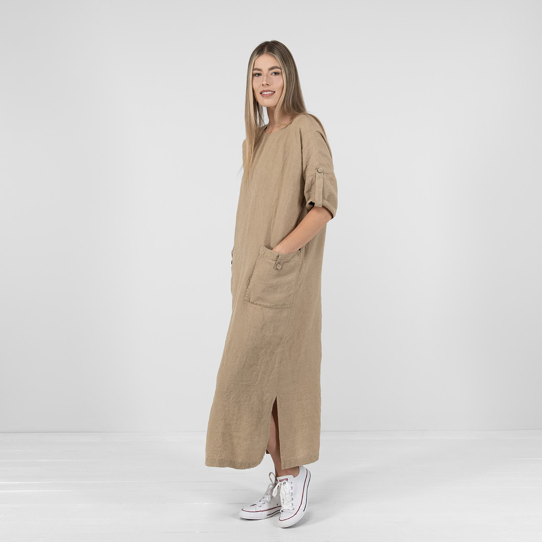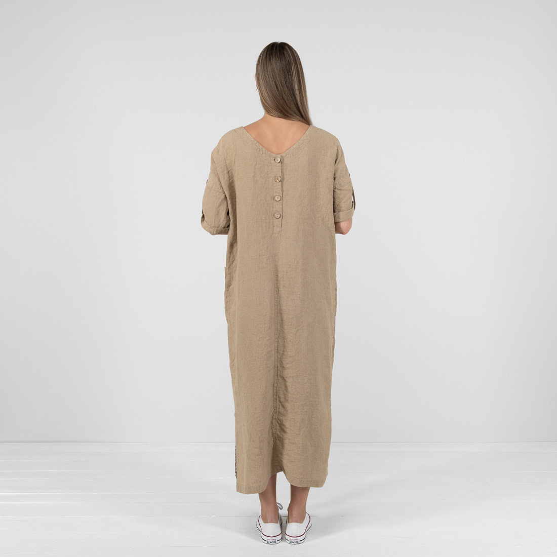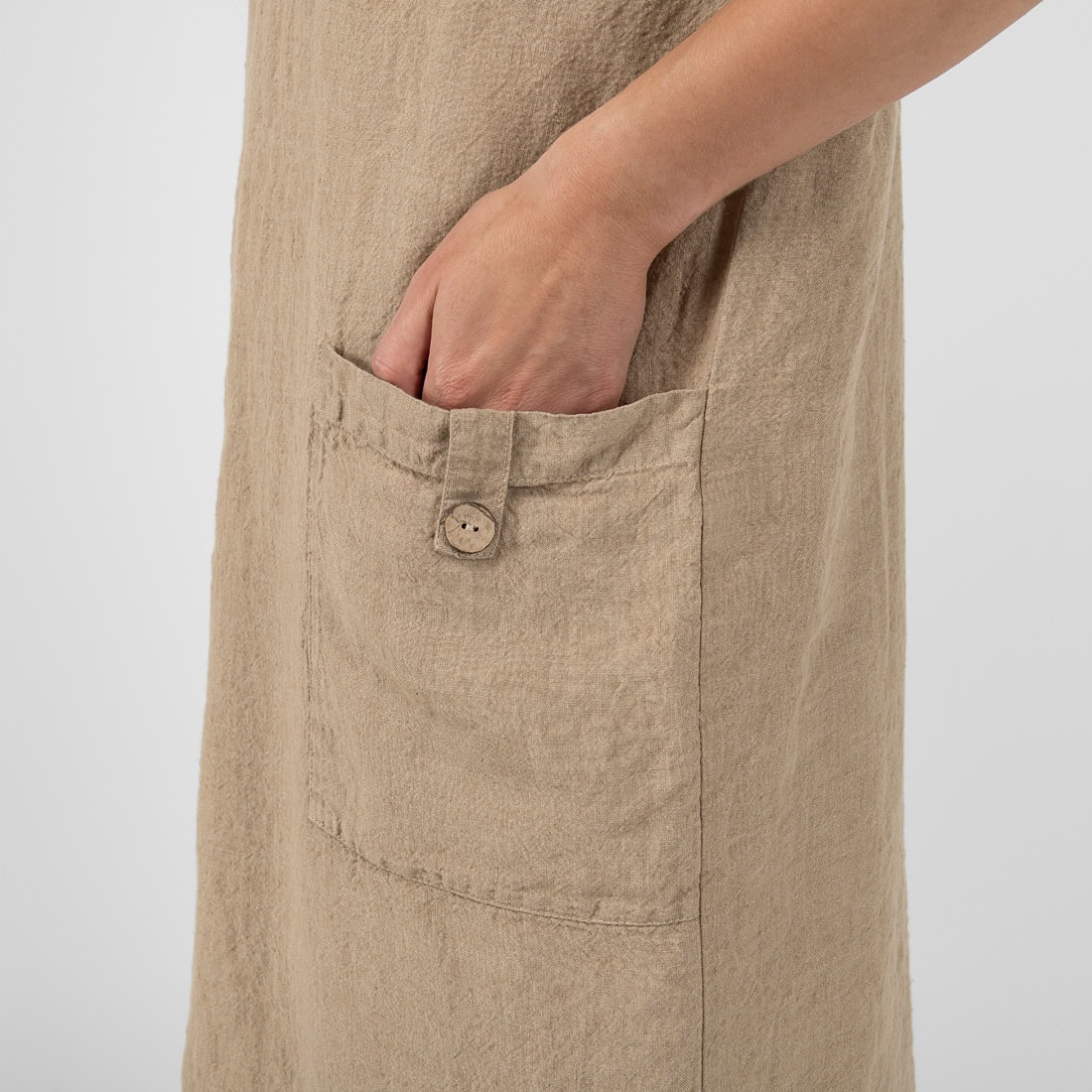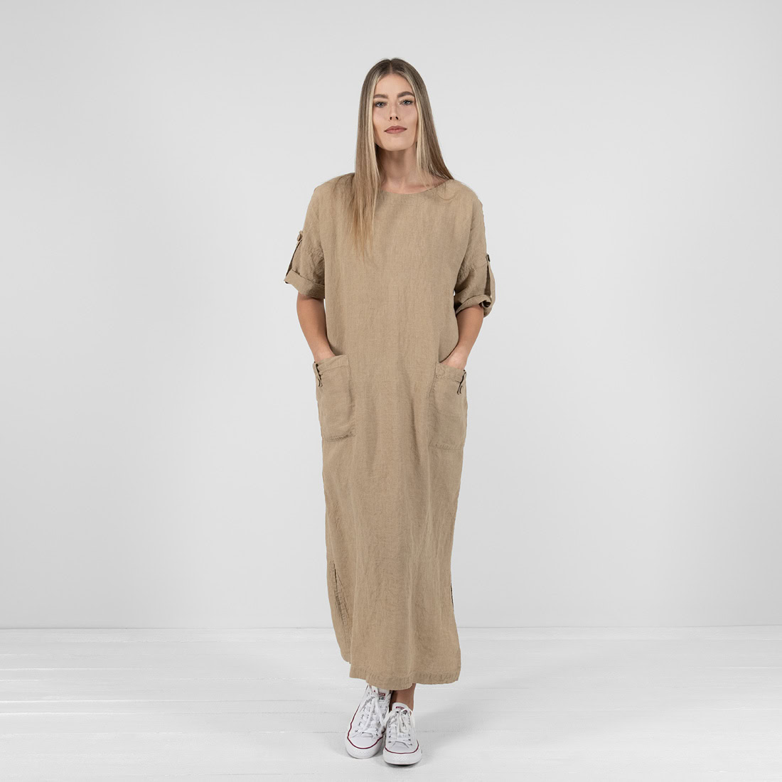 Šviesiai rudos spalvos 100% lininio audinio suknelė. Patogumas (judesių nevaržantis drabužio dizainas, didelės kišenės smulkmenoms susidėti) ir odai draugiškas audinys - tai patys svarbiausi kriterijai vasarą. Ir ši lininė suknelė juos puikiai atitinka!