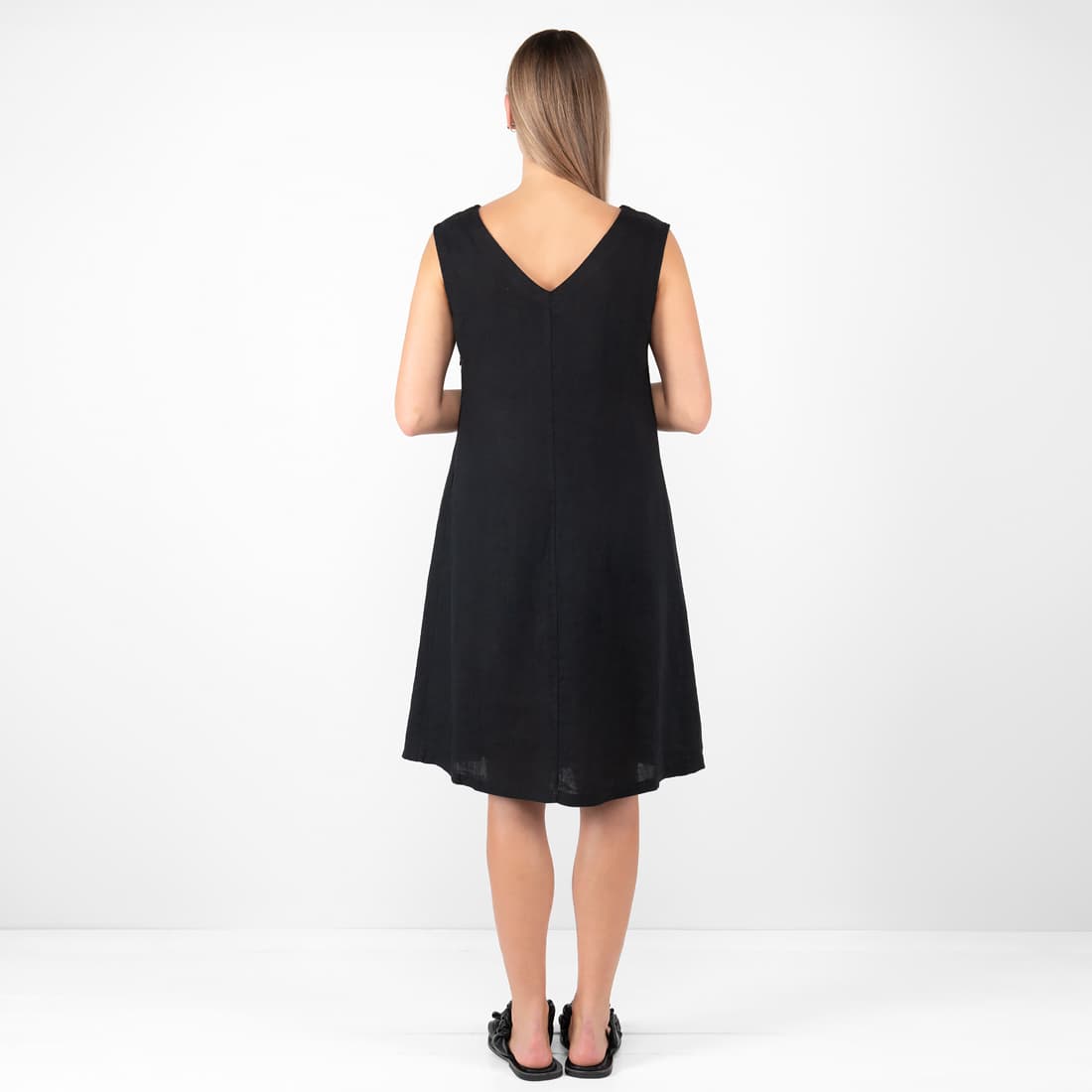 • Lininė juoda suknelė su pagilinta V formos iškirpte nugaroje