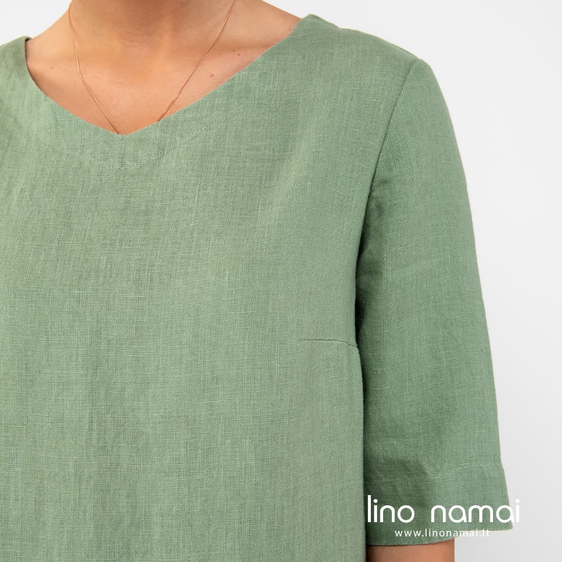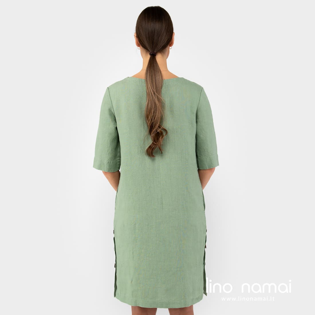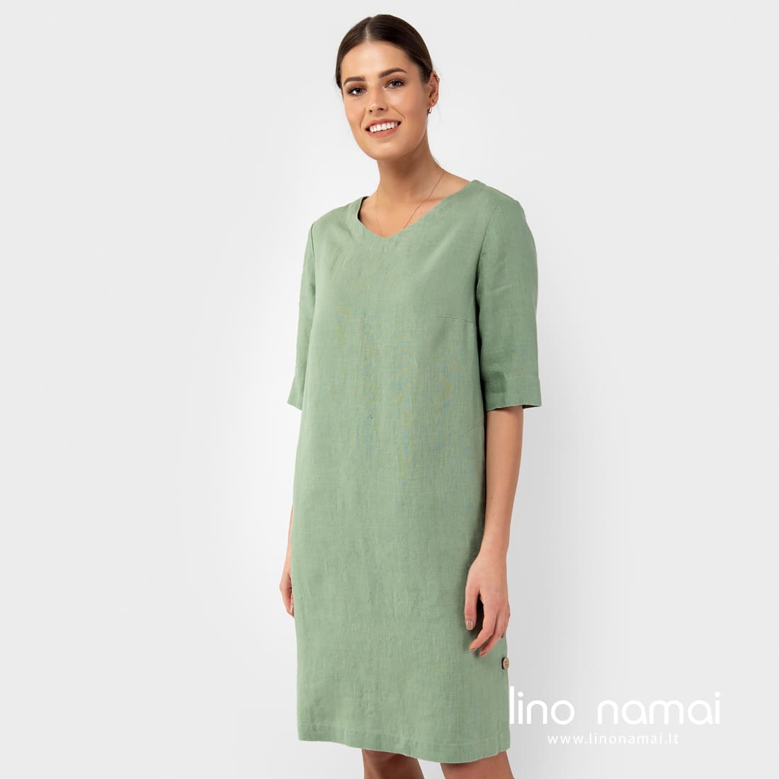 Švelniai žalia lininė suknelė. Subtiliai gaivi drabužio spalva, kelius siekiantis ilgis ir minkštas, švelnus audinys - ši suknelė puikiai tinka karštoms vasaros dienoms.