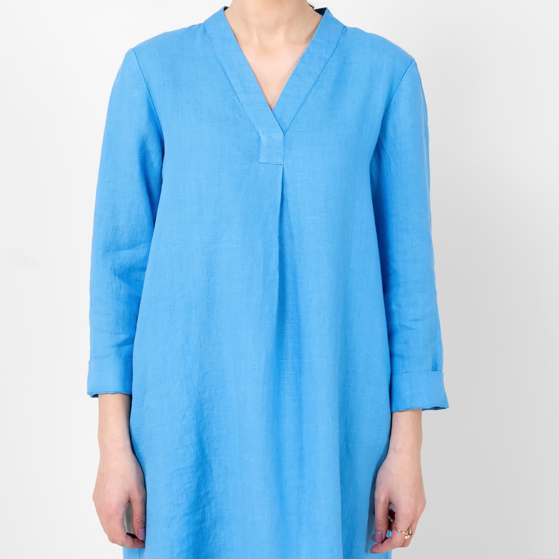 • MARA lininė žydra suknelė su V formos iškirpte plačiu apvadu
