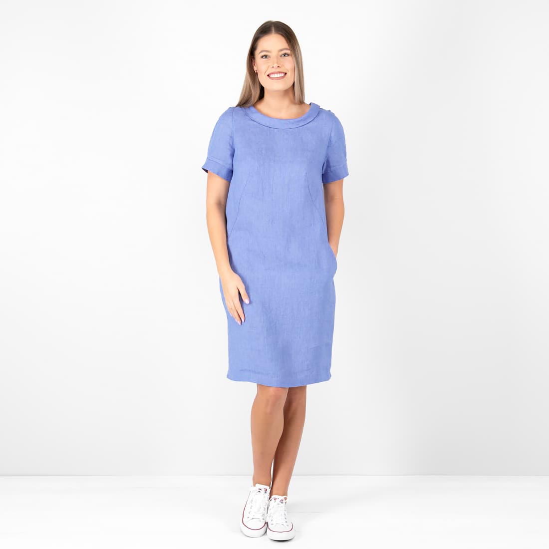 • Lininė mėlyna suknelė su apvalia iškirpte ir atlenkiama apykakle