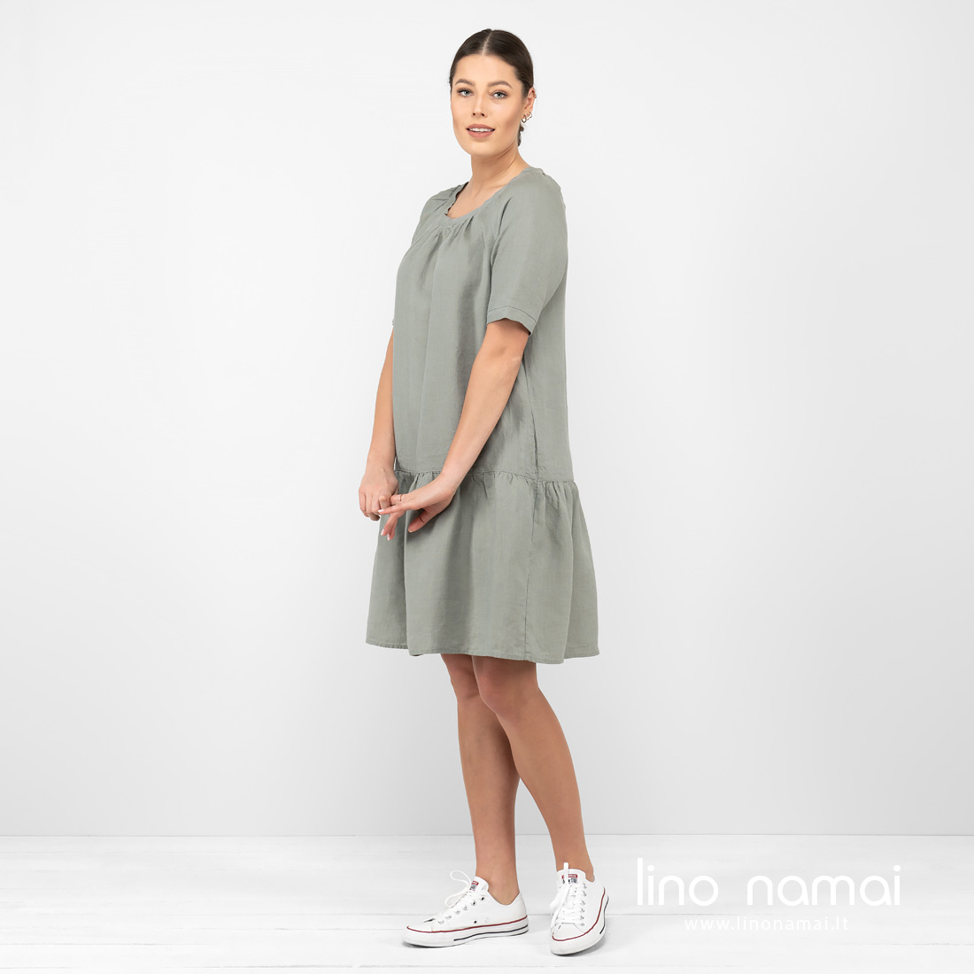 • Lininė suknelė žalsva su kišenėm šonuose.