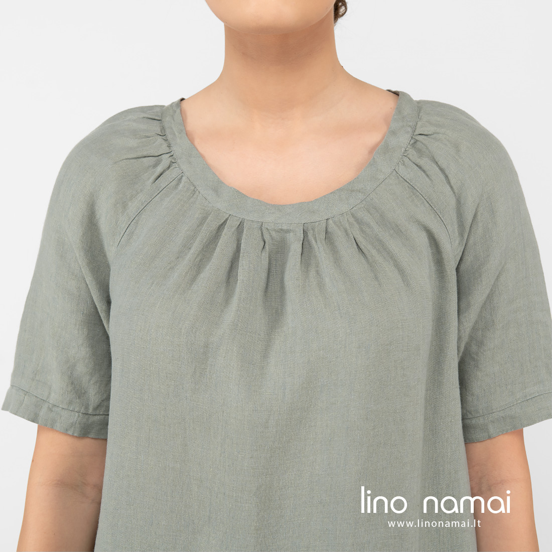• Lininė suknelė žalsva raukiniai aplink kaklą.