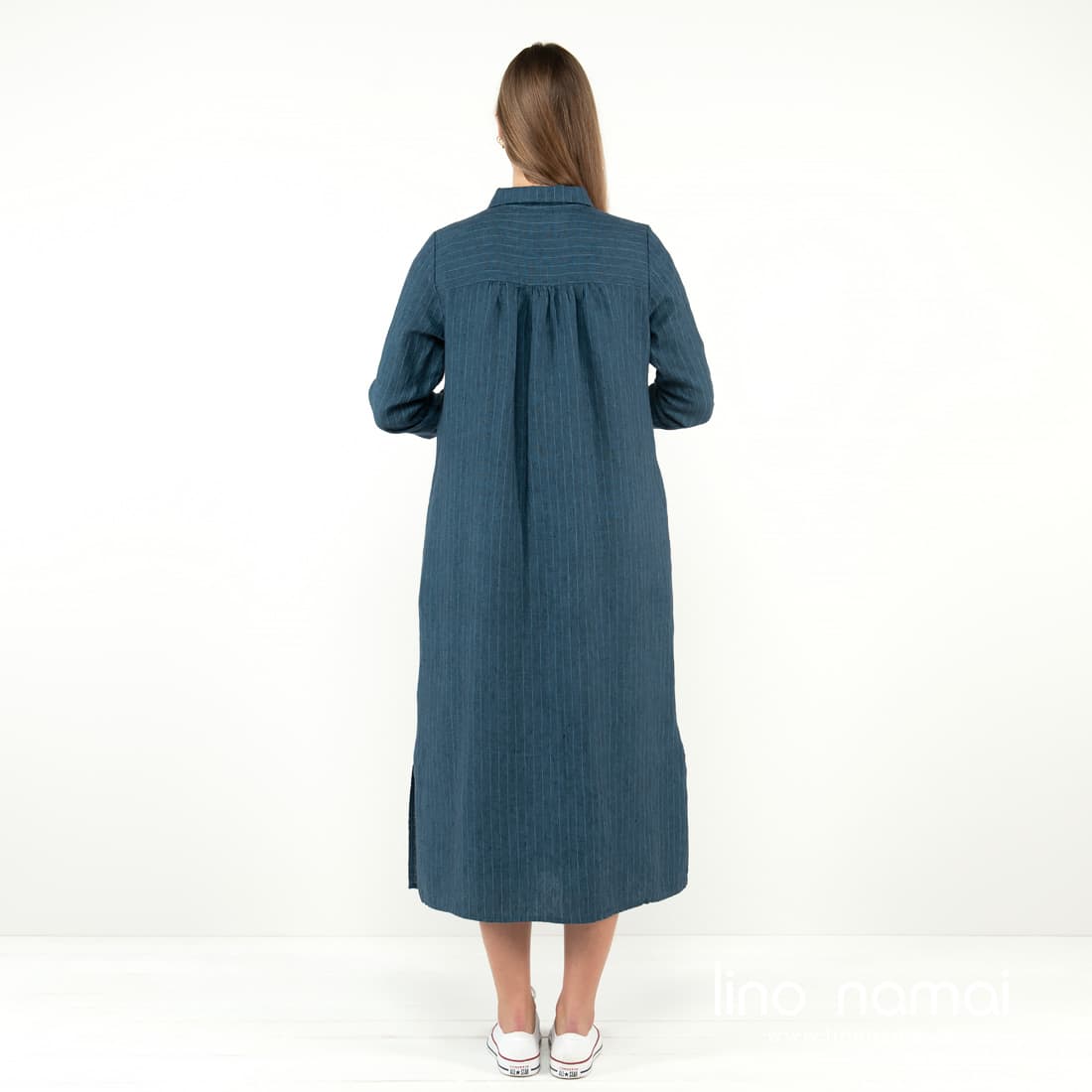 • Lininė ilga tamsiai mėlyna suknelė melsvai dryžiukais