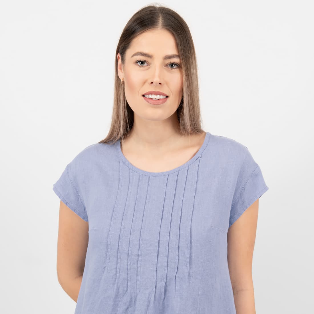 • Lininė melsva suknelė su dailiomis klostelėmis priekyje