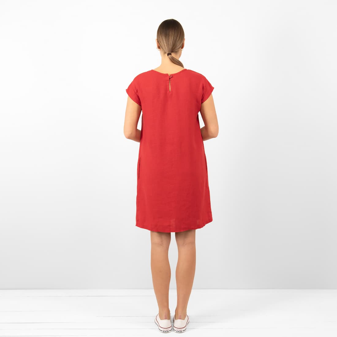 • Lininė raudona suknelė su sagutės užsegimu nugaroje