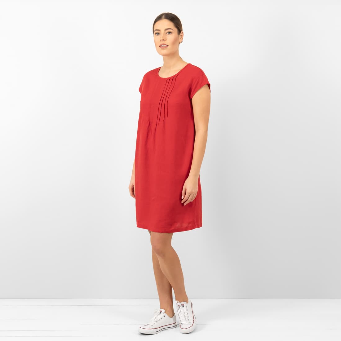 • Lininė raudona suknelė su dailiomis klostelėmis priekyje