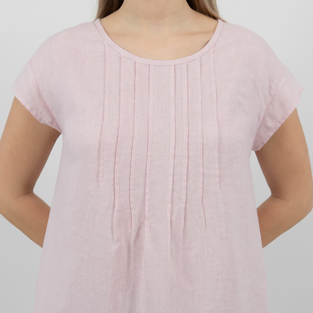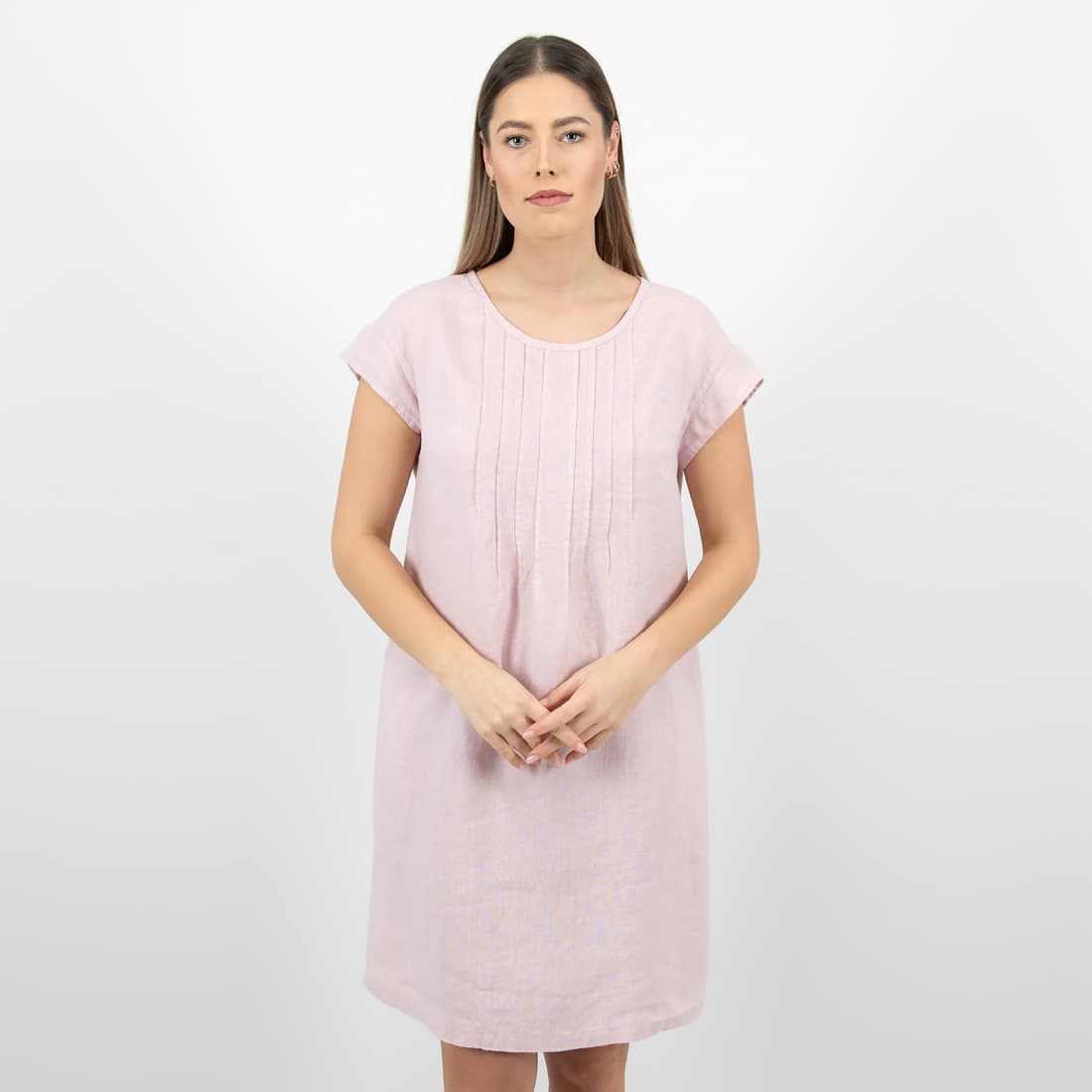 • Lininė rožinė suknelė su dailiomis klostelėmis priekyje
