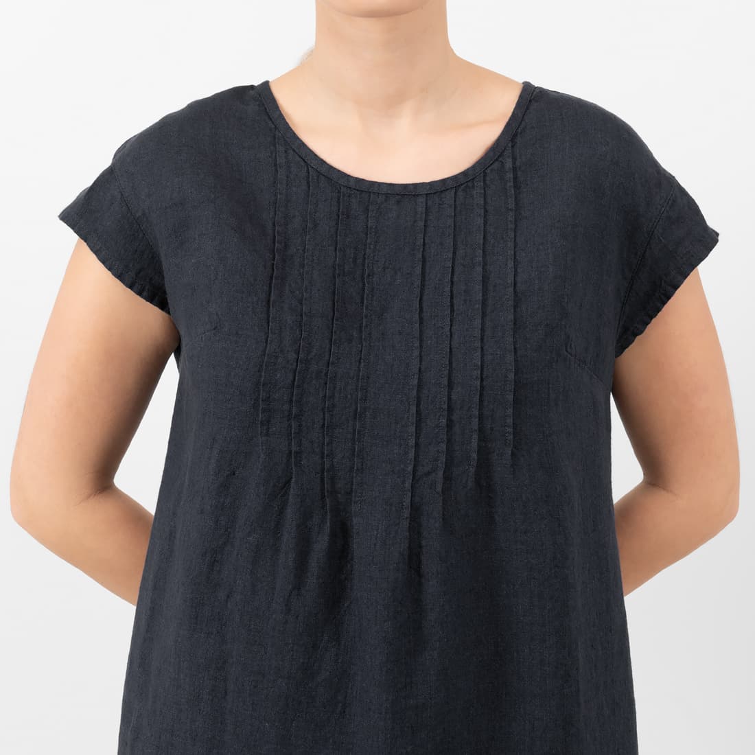 • Lininė tamsiai mėlyna suknelė apvalia iškirpte, trumpomis rankovėmis