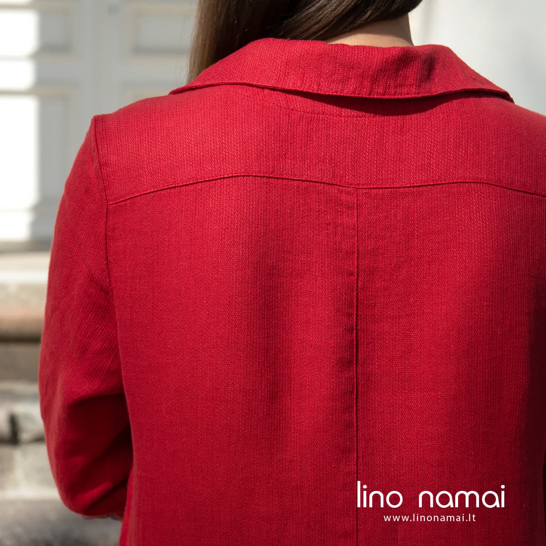 • Lininė ilga raudona suknelė su sagų užsegimu priekyje
