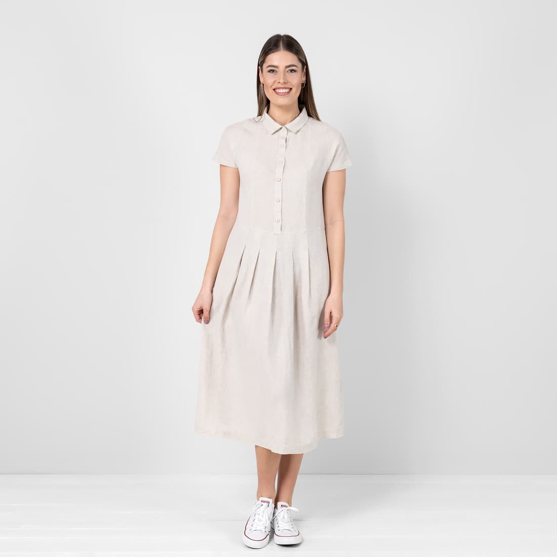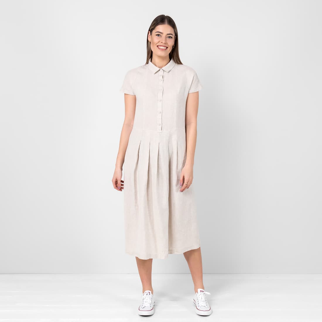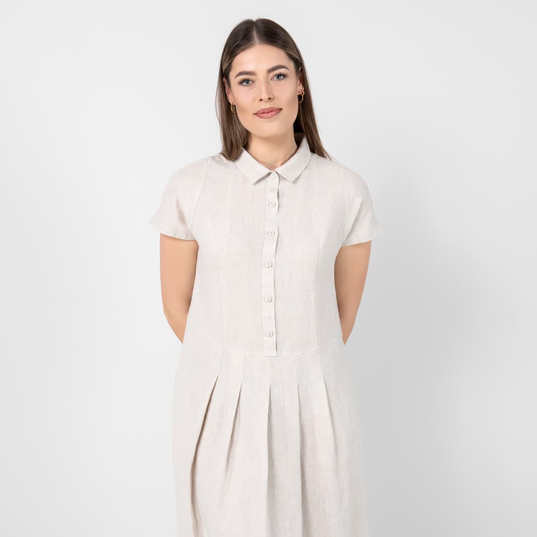- Detalės: trumpos rankovės; su klostėmis ir apykakle, susegimas priekyje, šone - kišenės