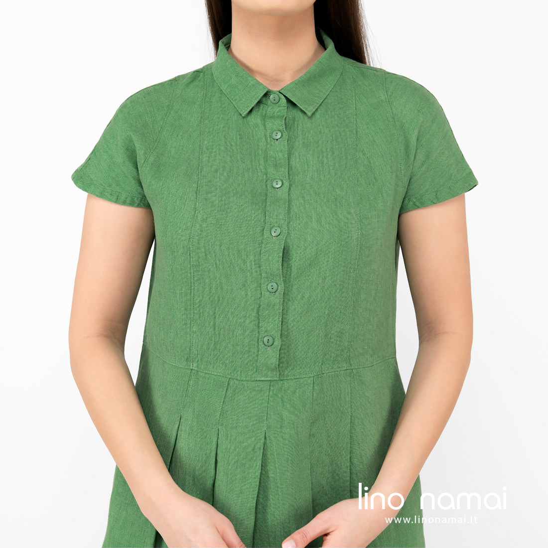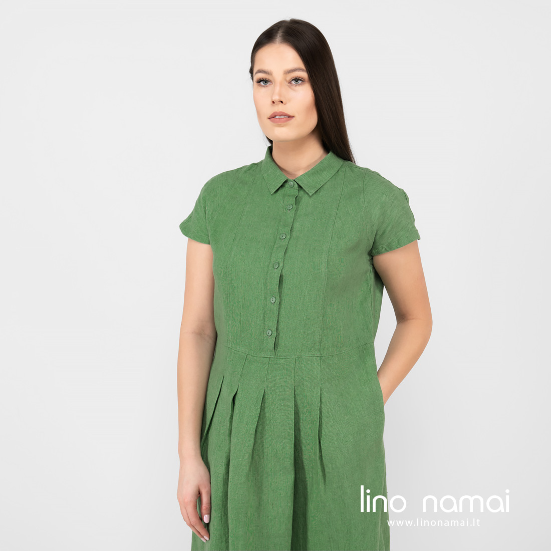 • Lininė žalia suknelė su apykakle ir klostėmis.