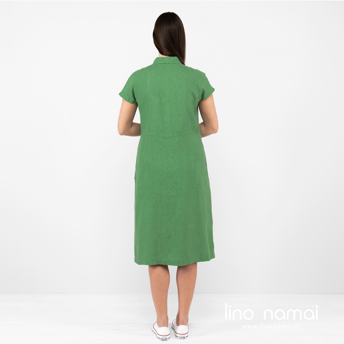 • Lininė žalia suknelė su apykakle ir kišenės šonuose.