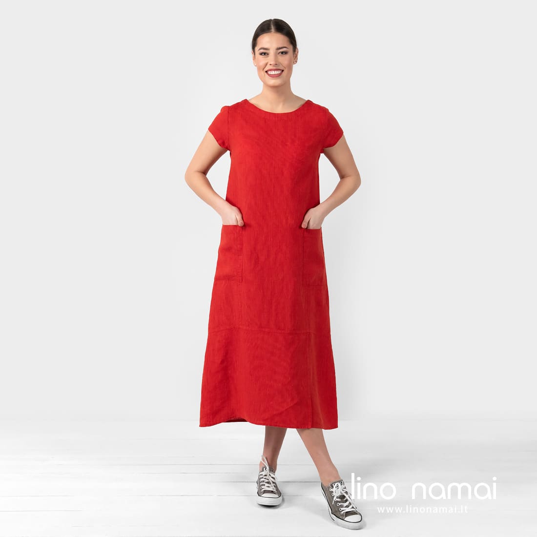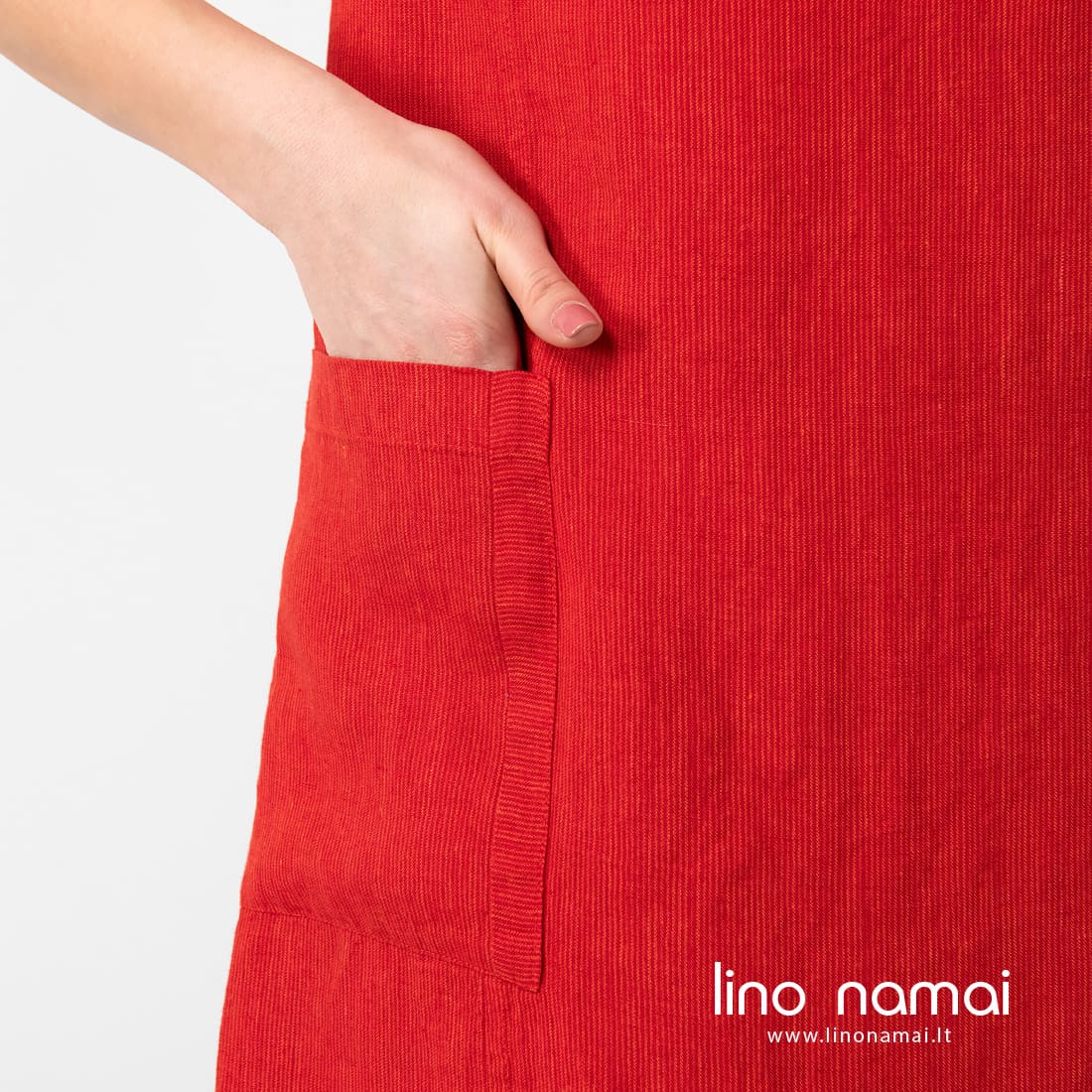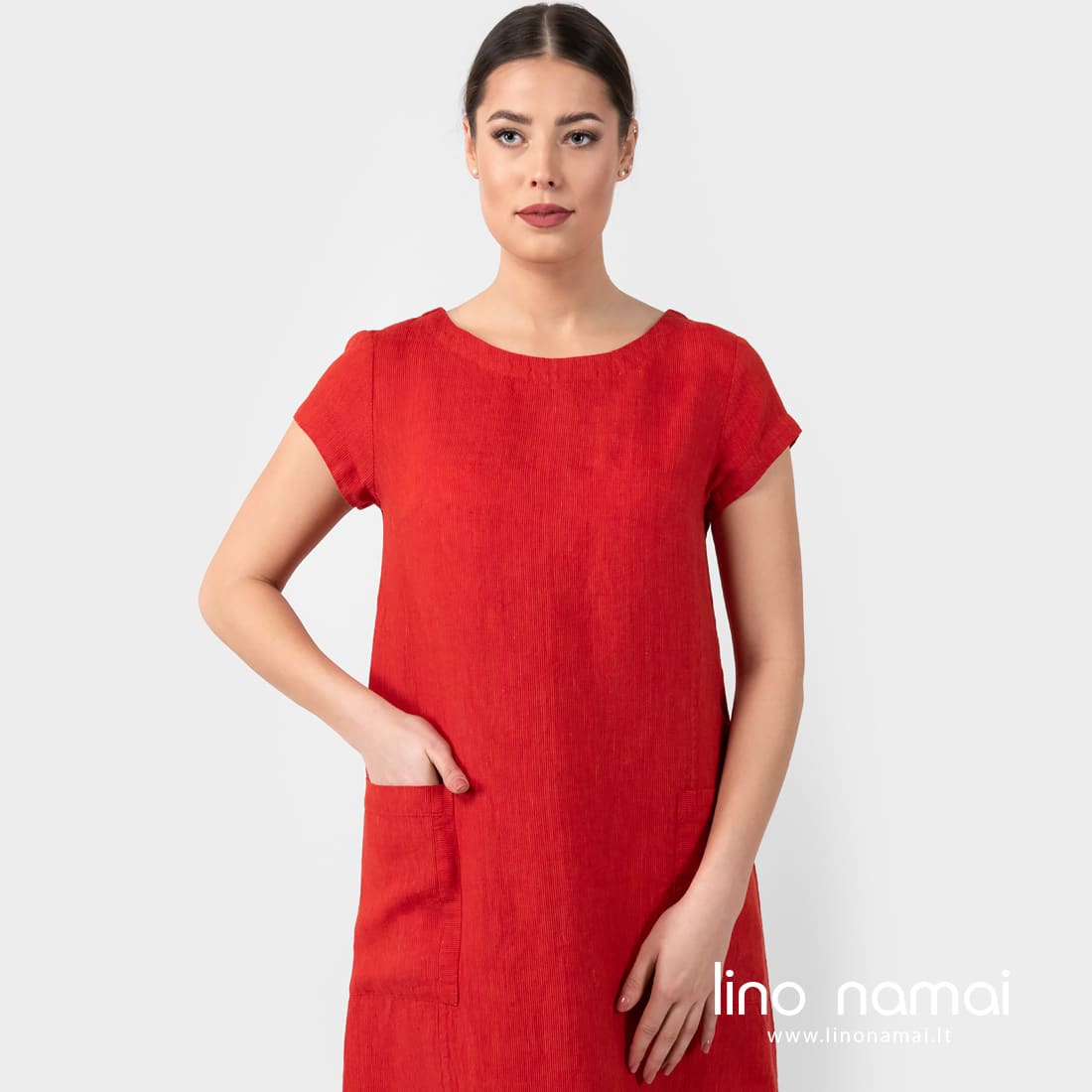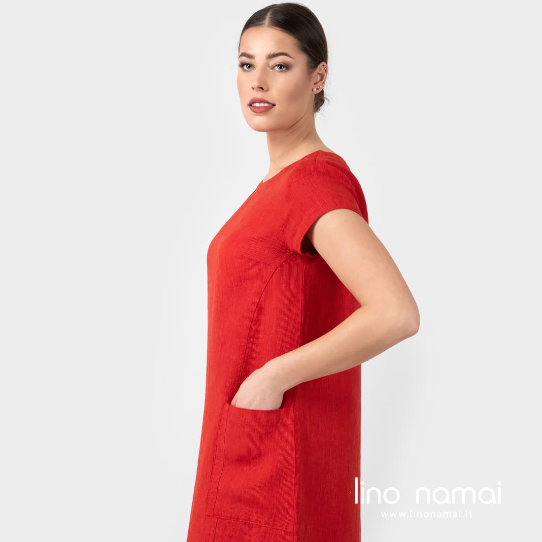 • Lininė raudona suknelė su kišenėmis šonuose