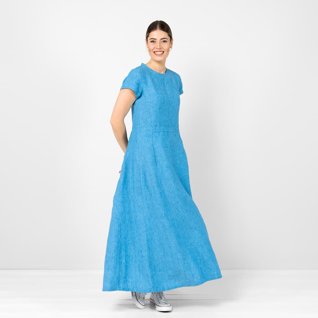 • Lininė mėlyna suknelė ilga laisva platėjanti