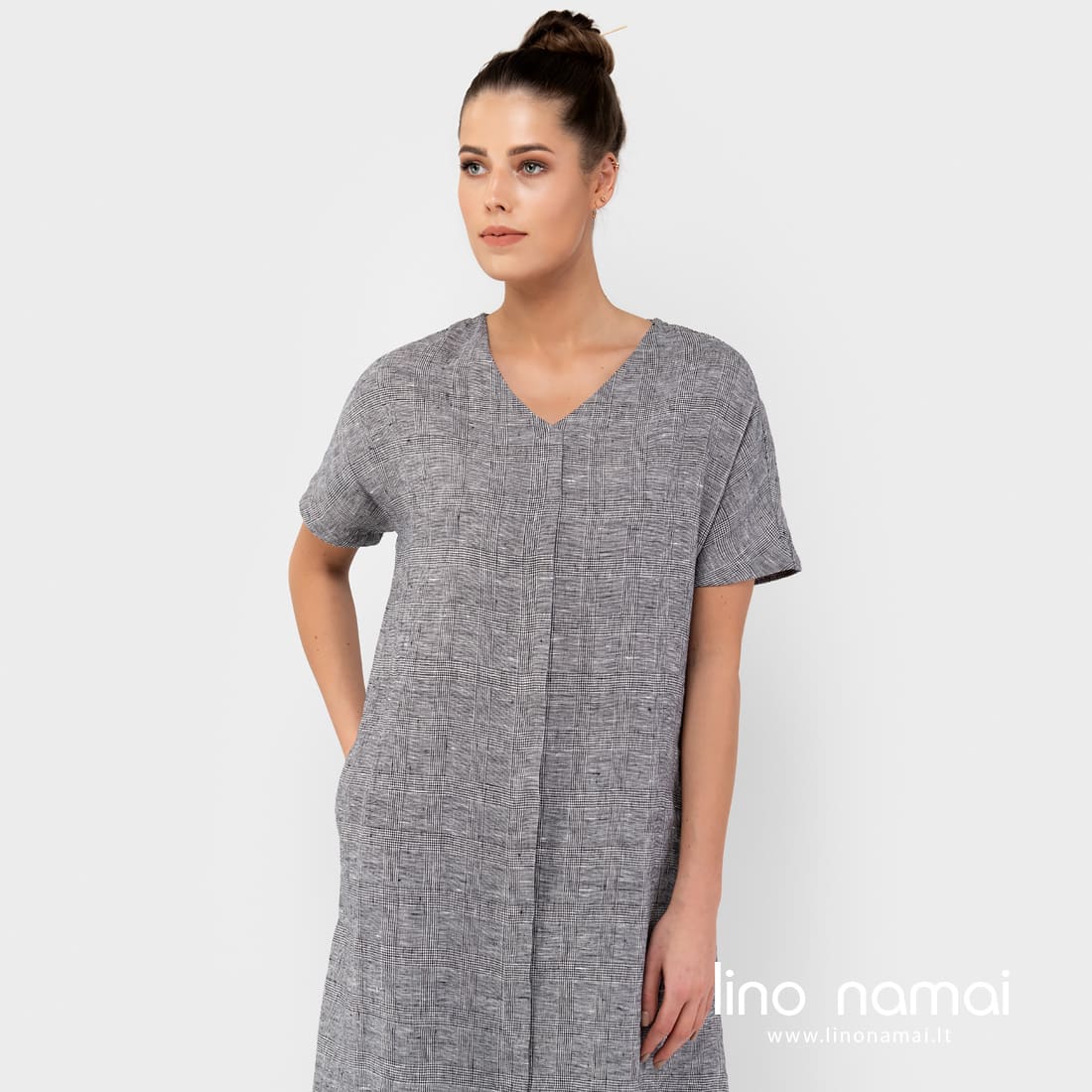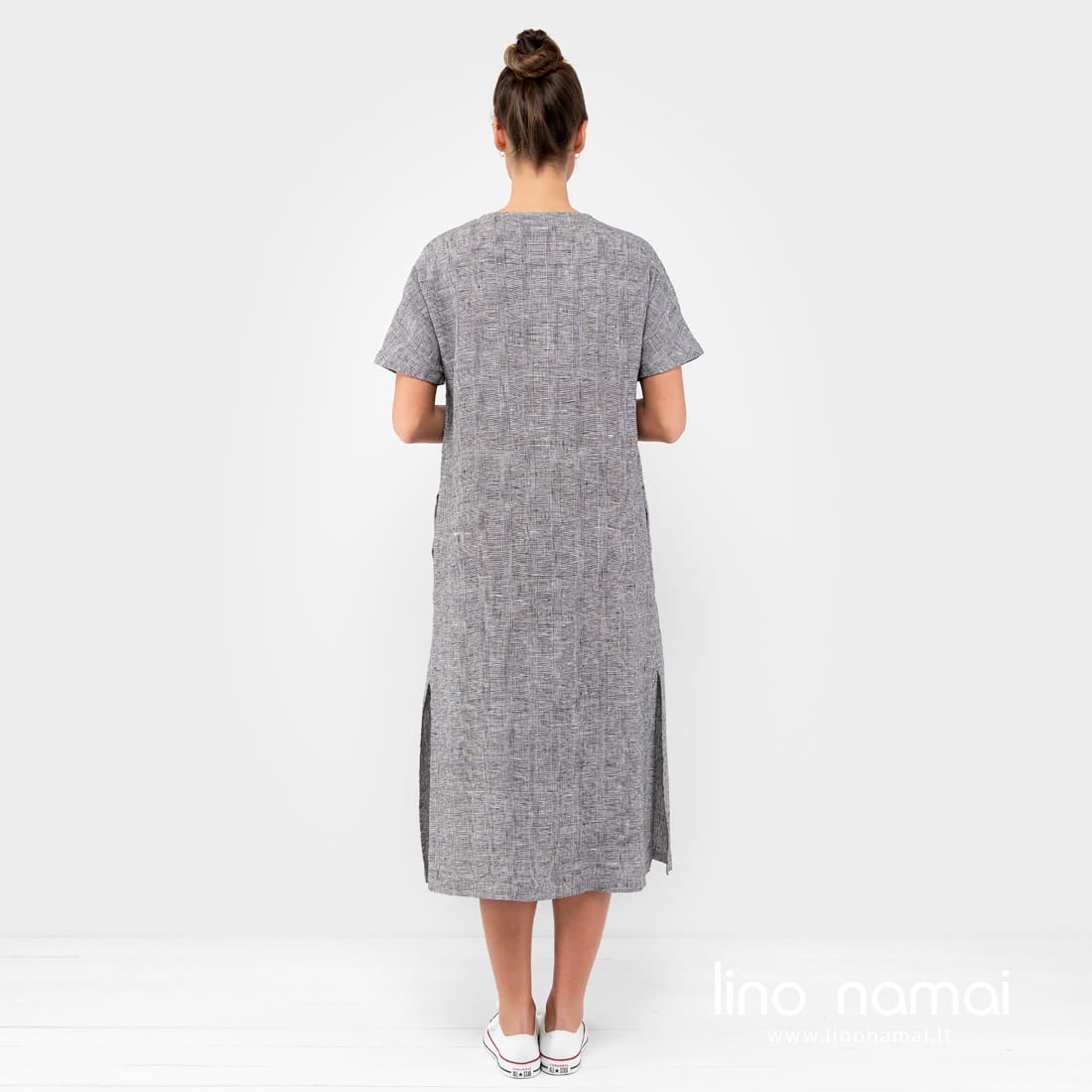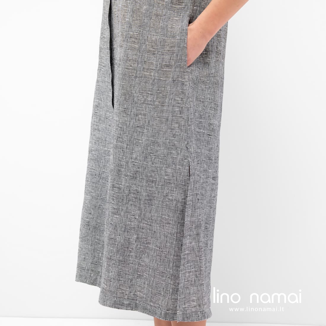 Lininė ilga languota suknelė. Gaminio audinys išaustas smulkiais langeliais iš juodų ir ryškiai baltų verpalų. Ši laisva suknelė - labai patogus drabužis greitam apsivilkimui, kai reikia nubėgti į parduotuvę, kai einate į terasą mėgautis rytine kava ar ruošiatės važiuoti prie ežero. Siūlome drabužį, kuris tinka visiems numatytiems ir nenumatytiems atvejams!
