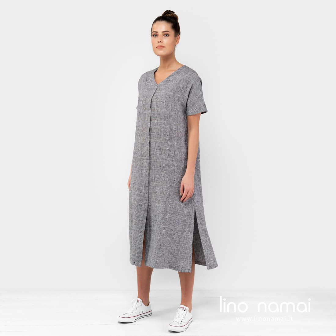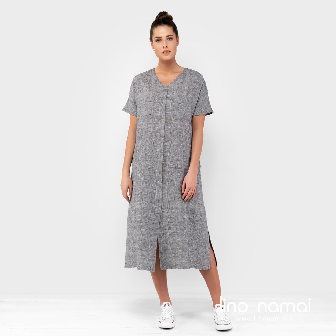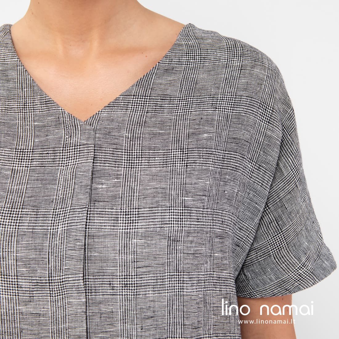 Lininė ilga languota suknelė. Gaminio audinys išaustas smulkiais langeliais iš juodų ir ryškiai baltų verpalų. Ši laisva suknelė - labai patogus drabužis greitam apsivilkimui, kai reikia nubėgti į parduotuvę, kai einate į terasą mėgautis rytine kava ar ruošiatės važiuoti prie ežero. Siūlome drabužį, kuris tinka visiems numatytiems ir nenumatytiems atvejams!