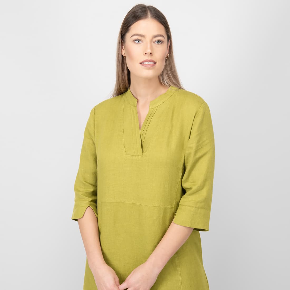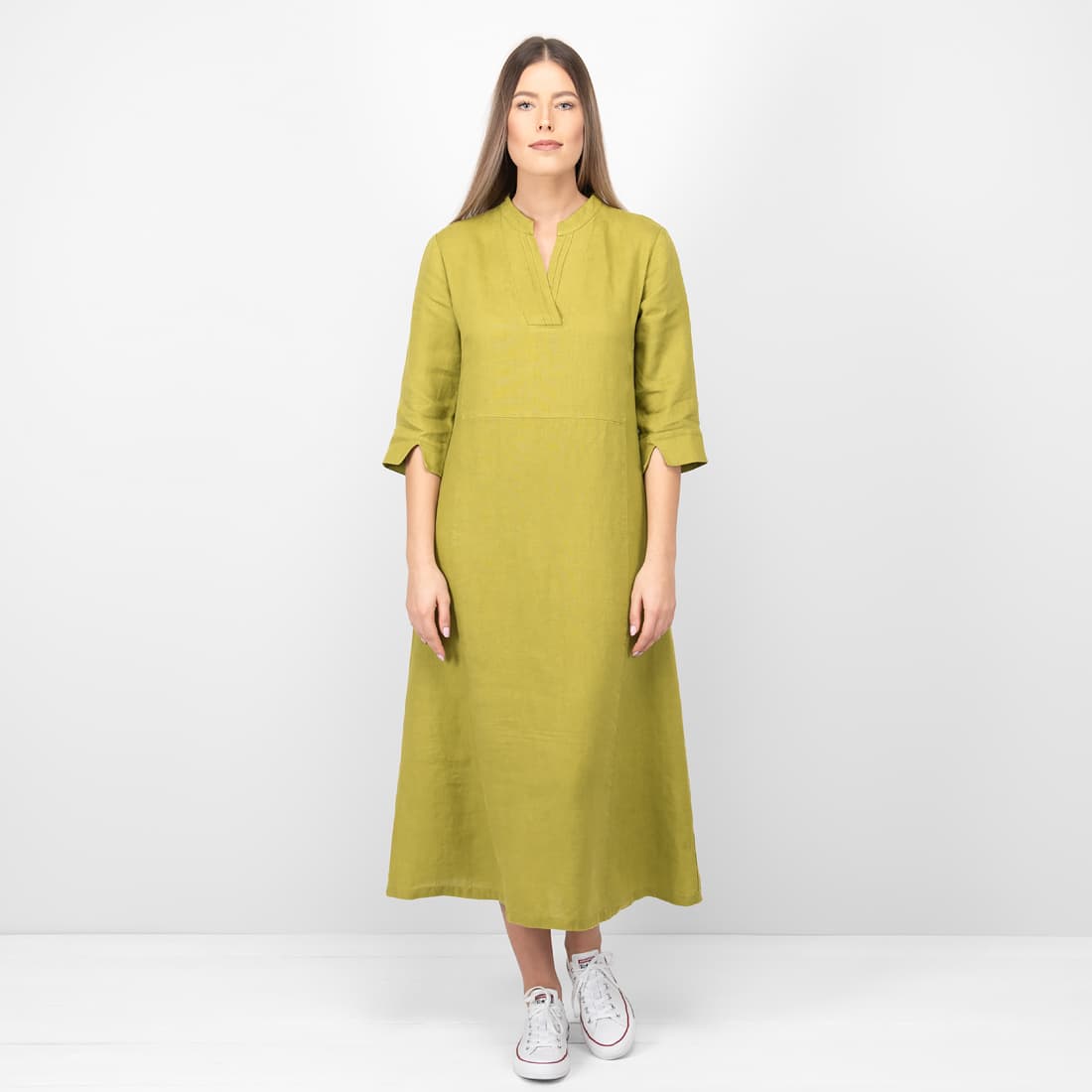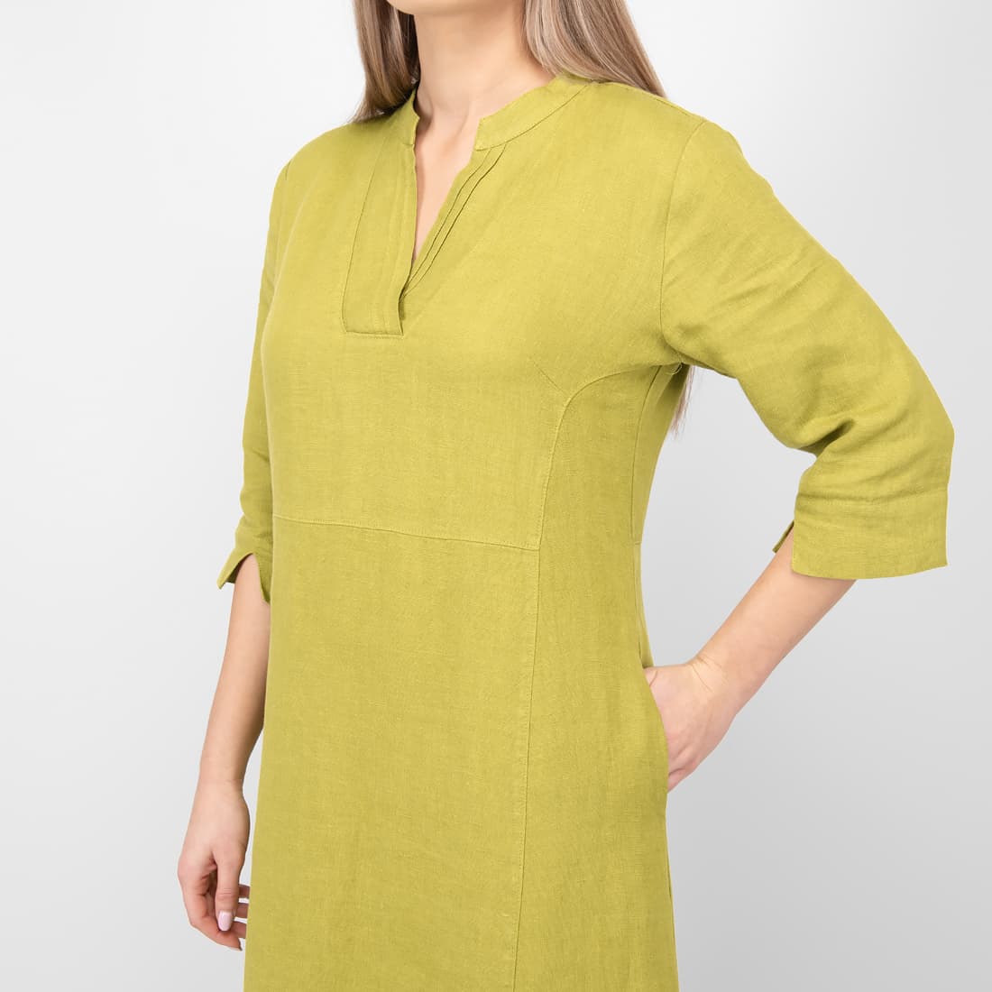 • Lininė gelsvai žalia suknelė su 3/4 rankovėmis